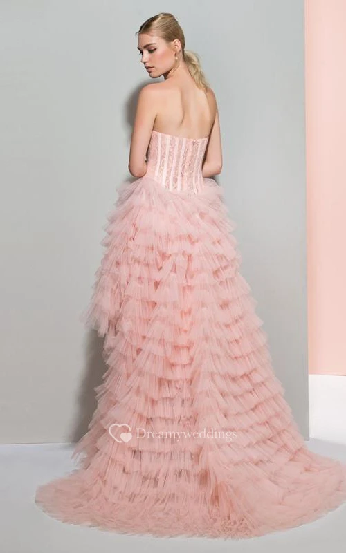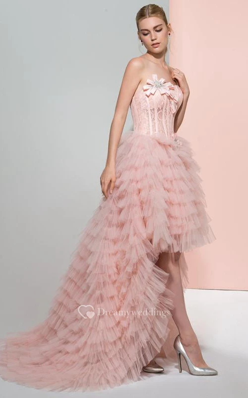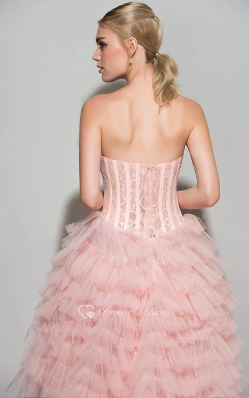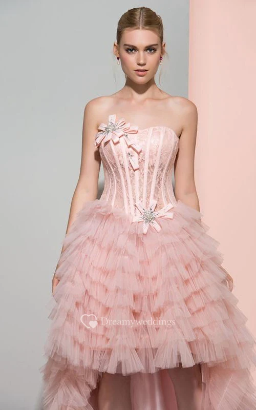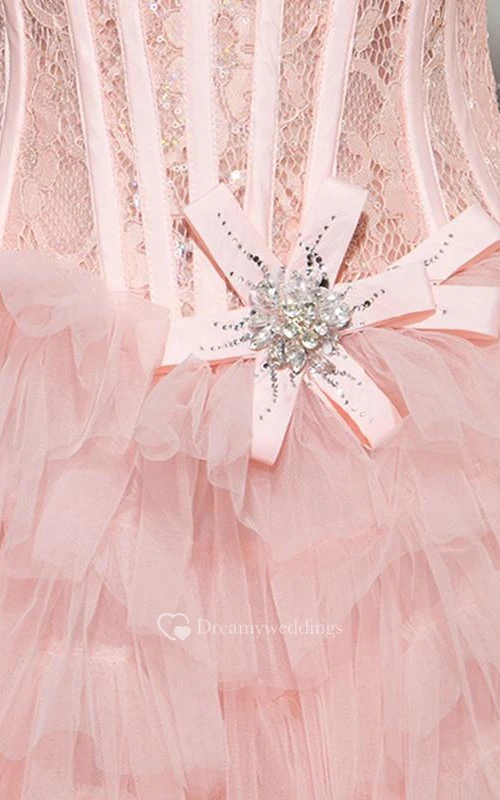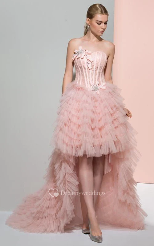 Strapless Ball Gown Beading Bowknot Lace Ruffles Tiered Sweep Train Prom Dress
