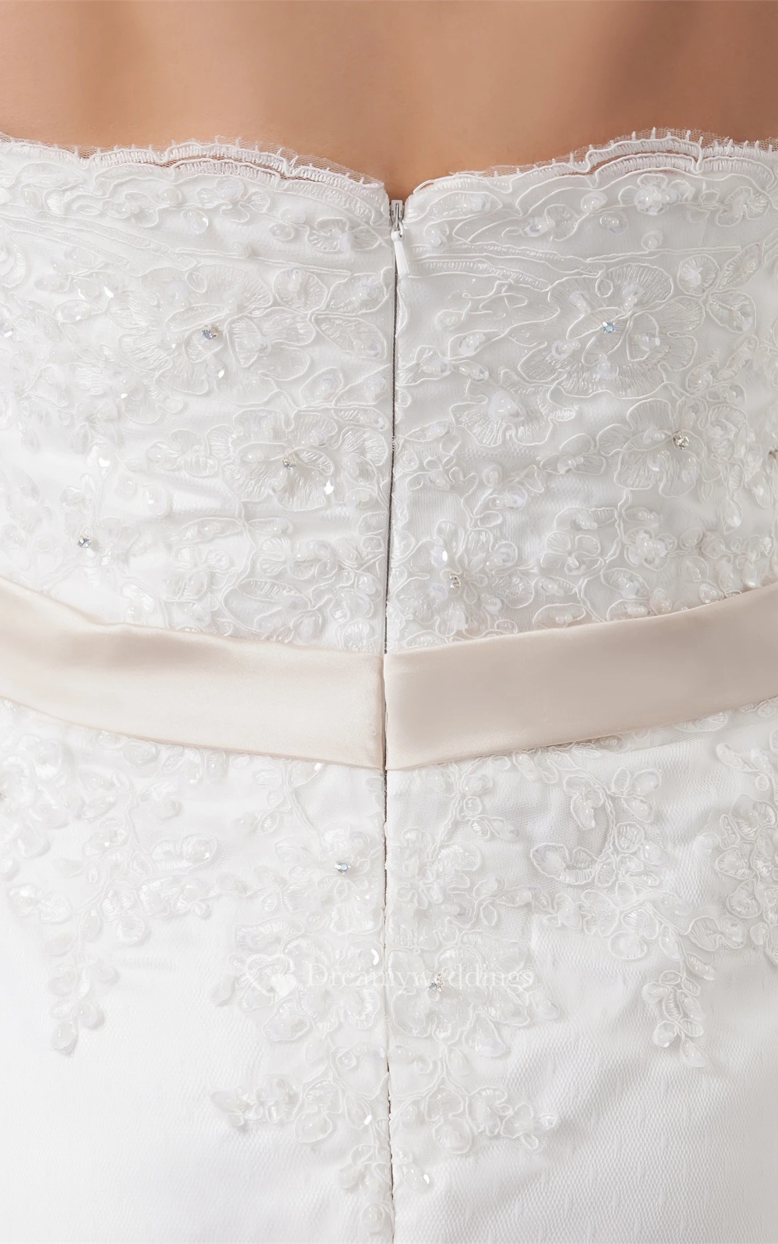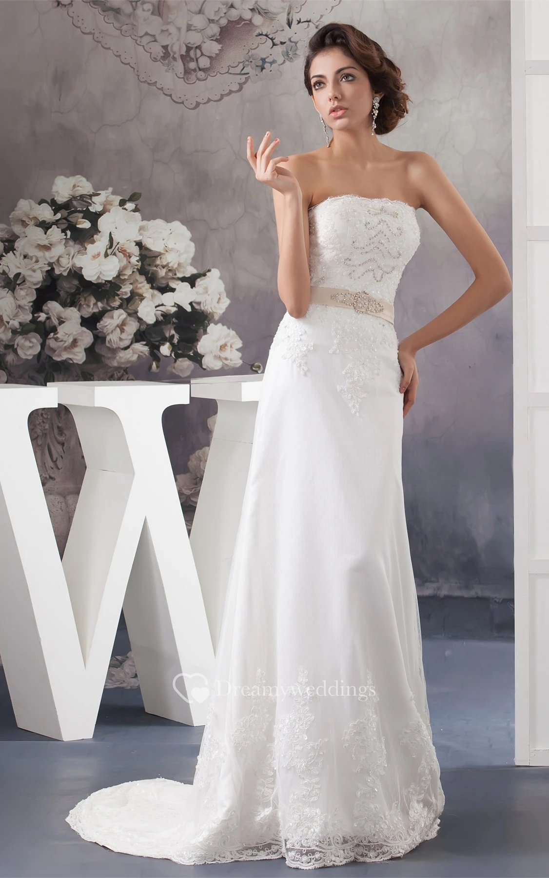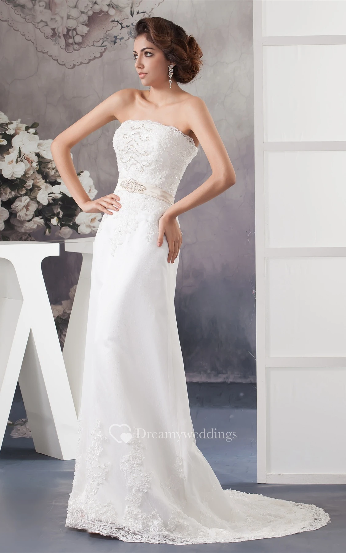 Strapless Beaded A-Line Sweep Train and Dress With Lace