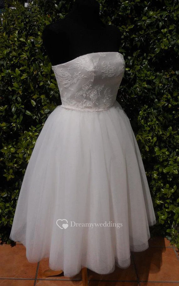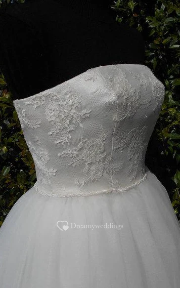 Strapless Lace and Tulle Tea Length A-Line Dress With Lace-Up Back