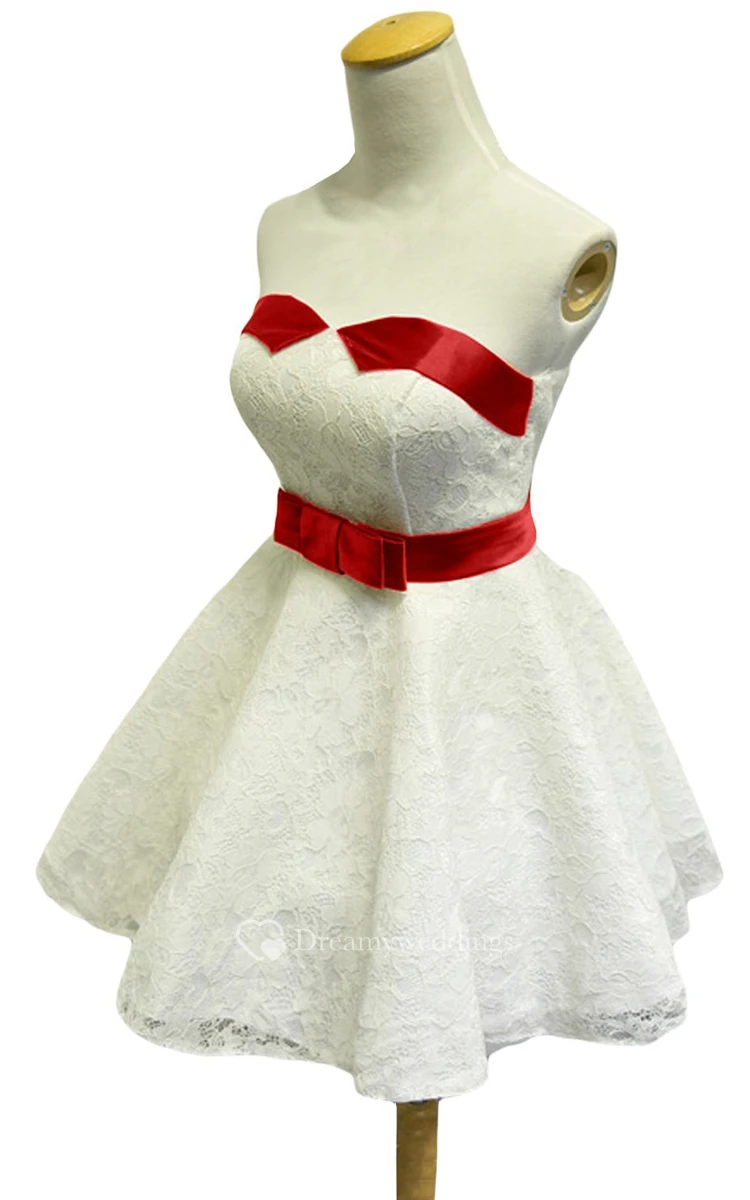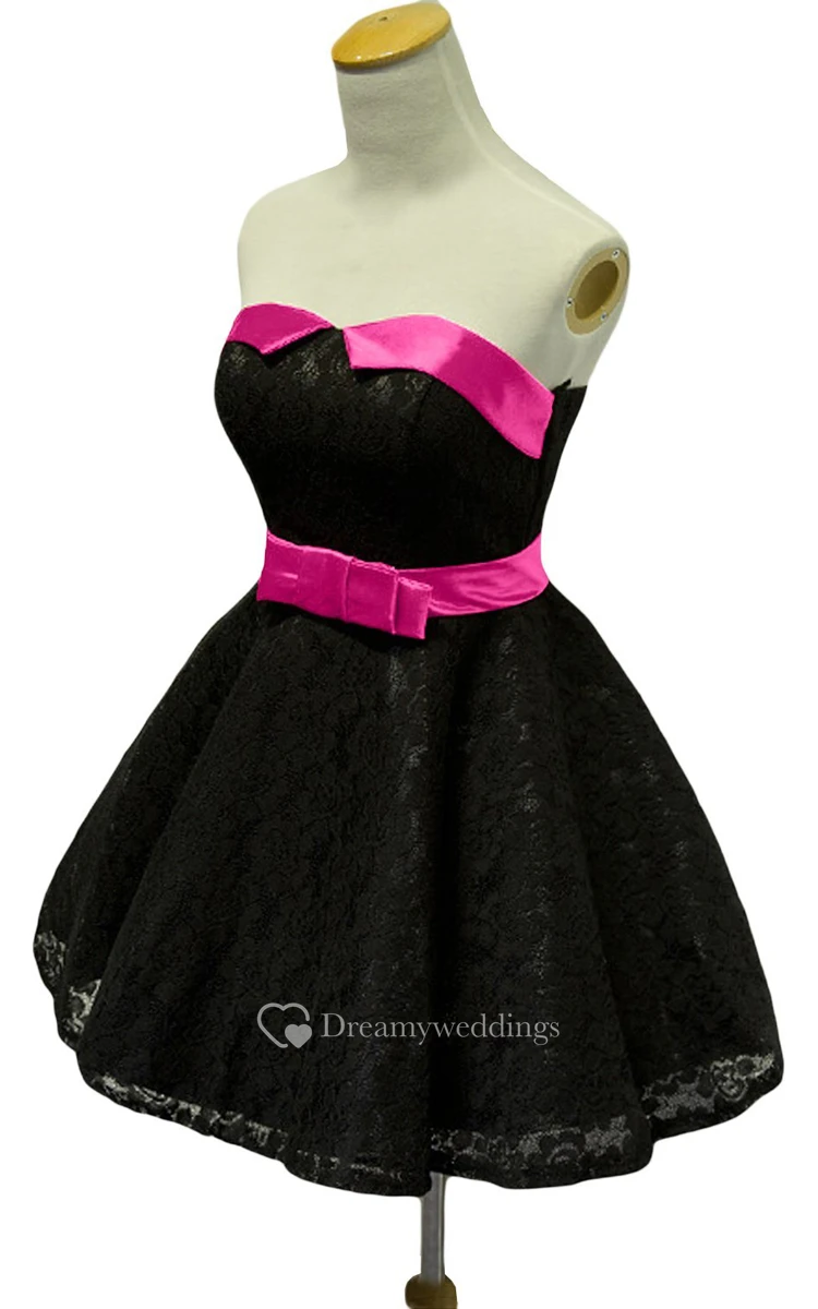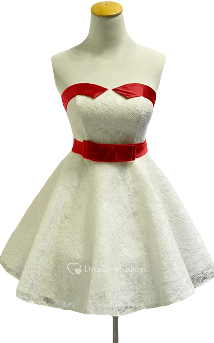 Strapless Lace Short Dress With Satin Trim and Belt
