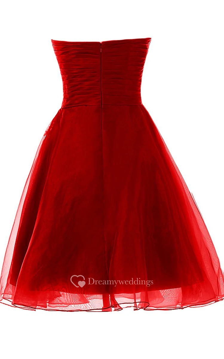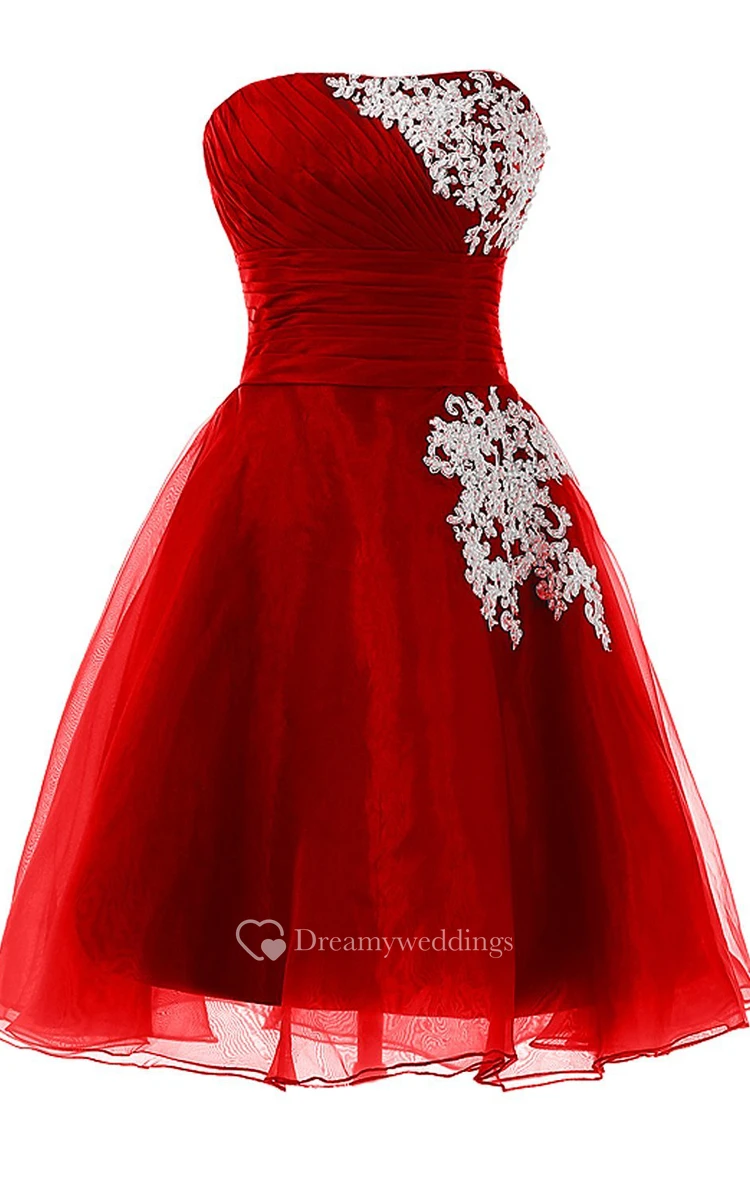 Strapless Pleated Dress With Ruching and Tulle Overlay