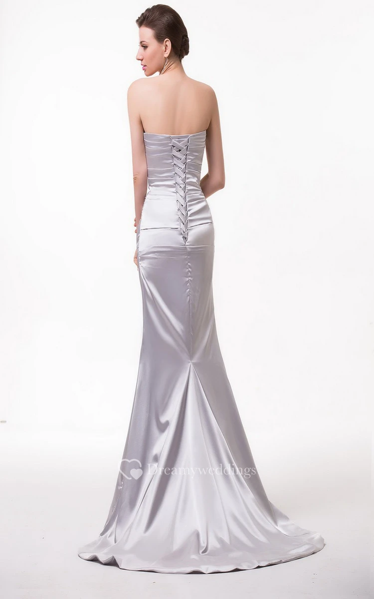 Strapless Satin Gown With Asymmetrical Ruching and Beading