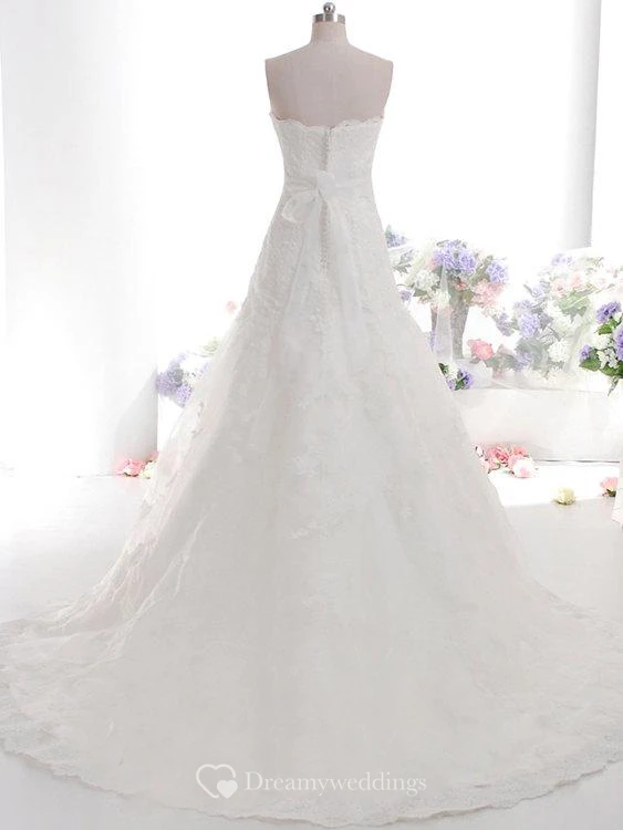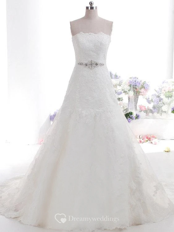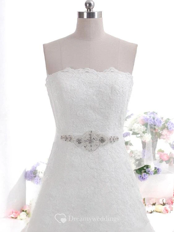 Strapless Scalloped Neckline A-Line Lace Dress With Beaded Sash