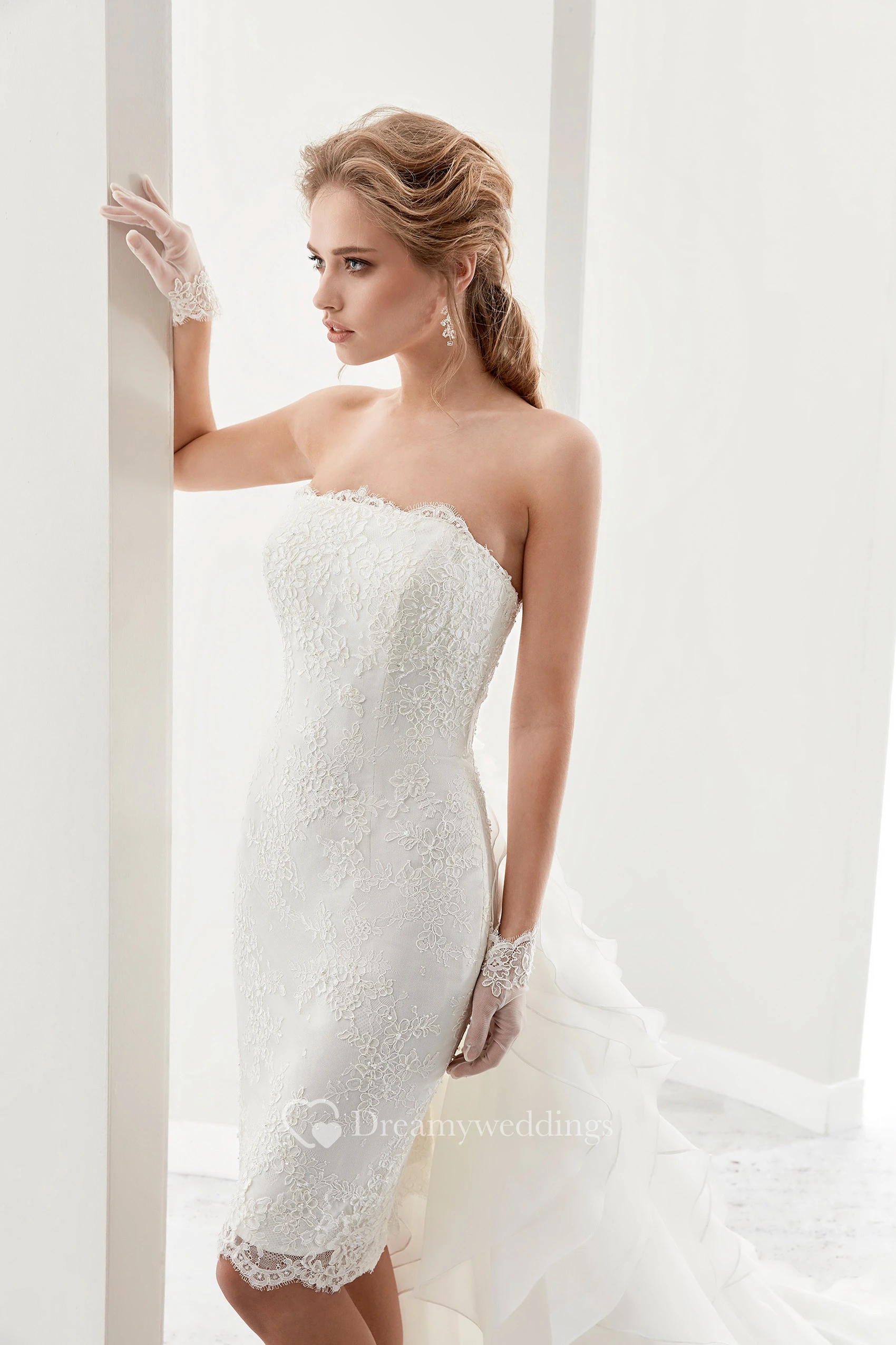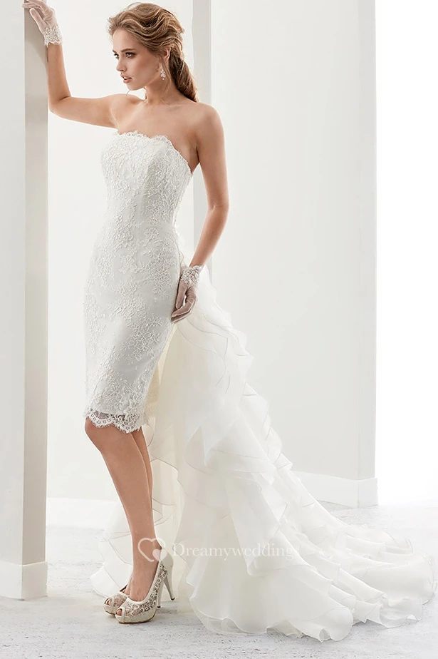 Strapless Short Lace Gown With Detachable Ruffles Train
