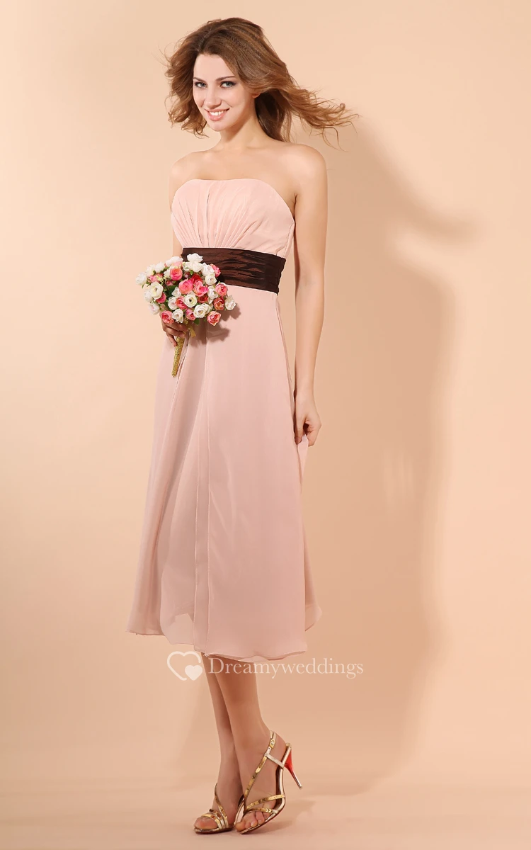 Strapless Tea-Length Chiffon Dress With Ruching Waist