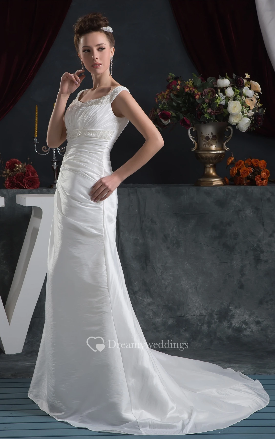 Strapped Taffeta A-Line Ruched Dress With Crystal Detailing