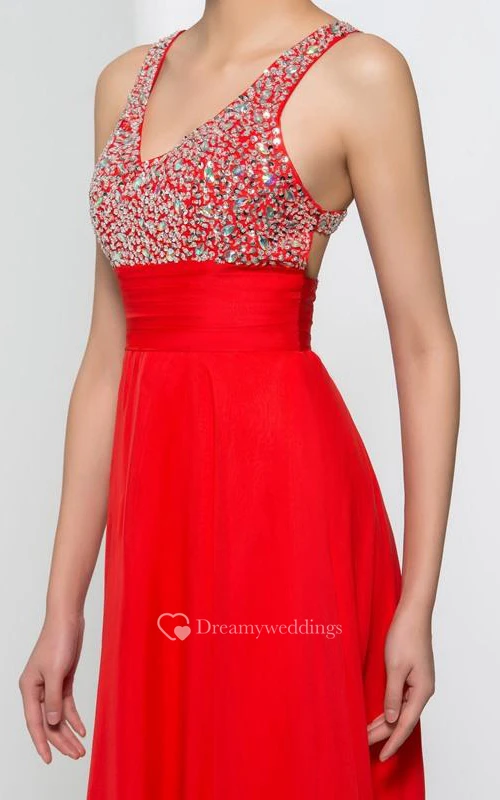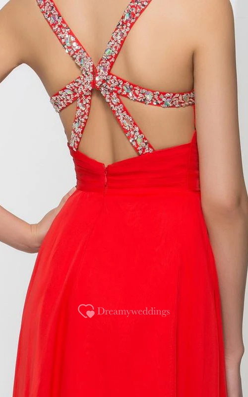Straps Beading Pleats Criss-Cross Back Prom Dress