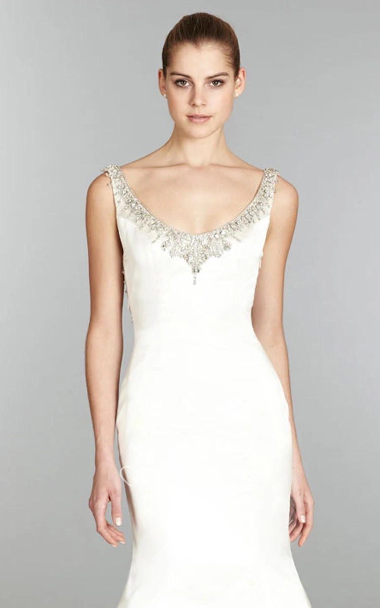 Stunning Beaded Scoop Neckline Satin Dress With Crystal Embroidered V Back
