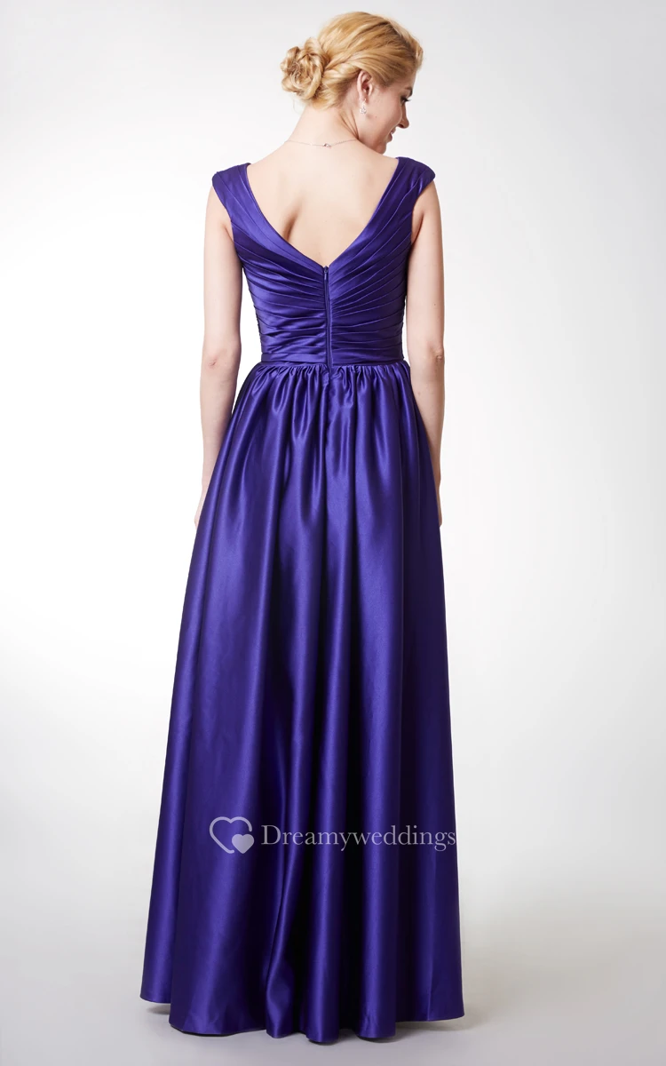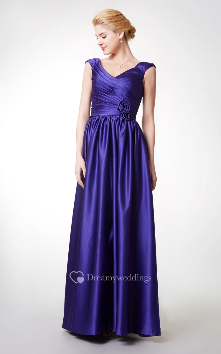 Stunning Cap-sleeved V-neck Long Satin Dress With Flowers