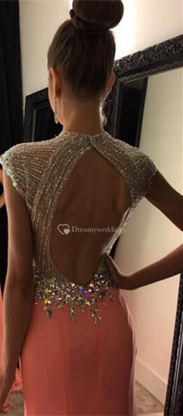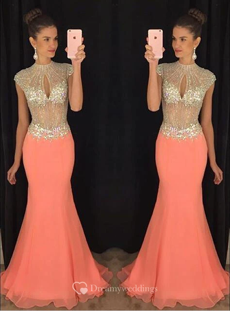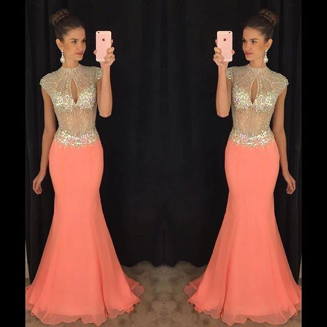 Stunning High-Neck Crystal Prom Dresses Mermaid Long Chiffon Party Gown
