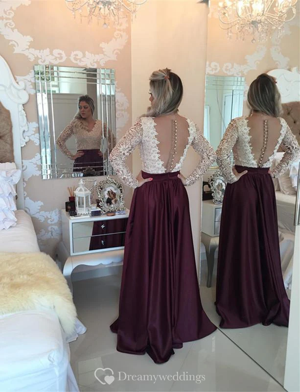 Stunning Long Sleeve Lace Pearls Prom Dresses Long Party Gowns