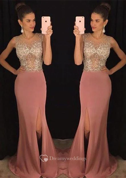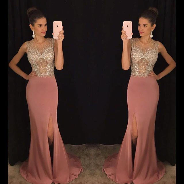 Stunning Sleeveless Crystal Prom Dresses Slit Floor Length