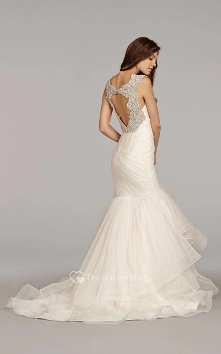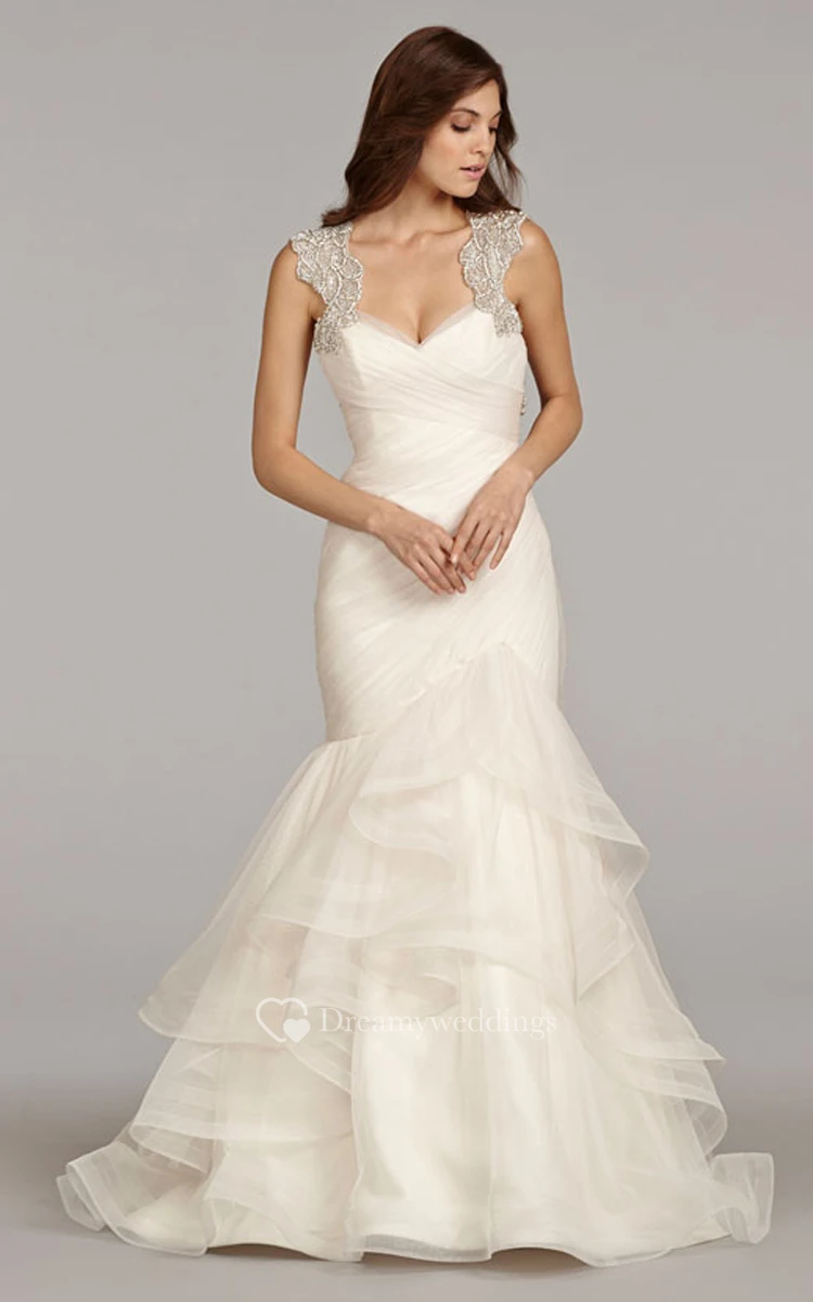 Delicate organza makes this soigné gown a veritable essence of purity and lightness. Sweetheart neckline features scalloped edge beaded lace straps running into a gorgeous key-hole back forming two angel wings. Ruched bodice wraps you in a perfectly fitting mermaid silhouette with a dramatically flaring below the hipline skirt adorned with a ruffled cascade and sweep train.