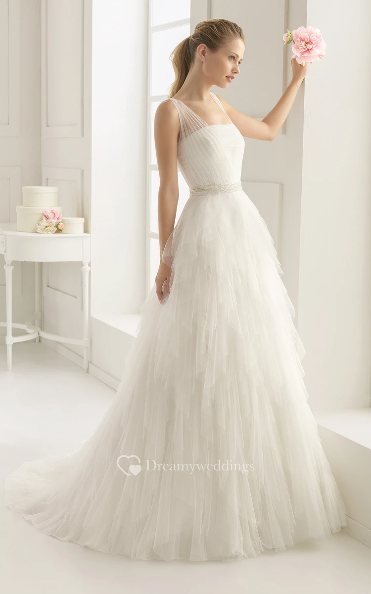 Stunning Top-Ruched Layered Gown With Beaded Tulle Straps
