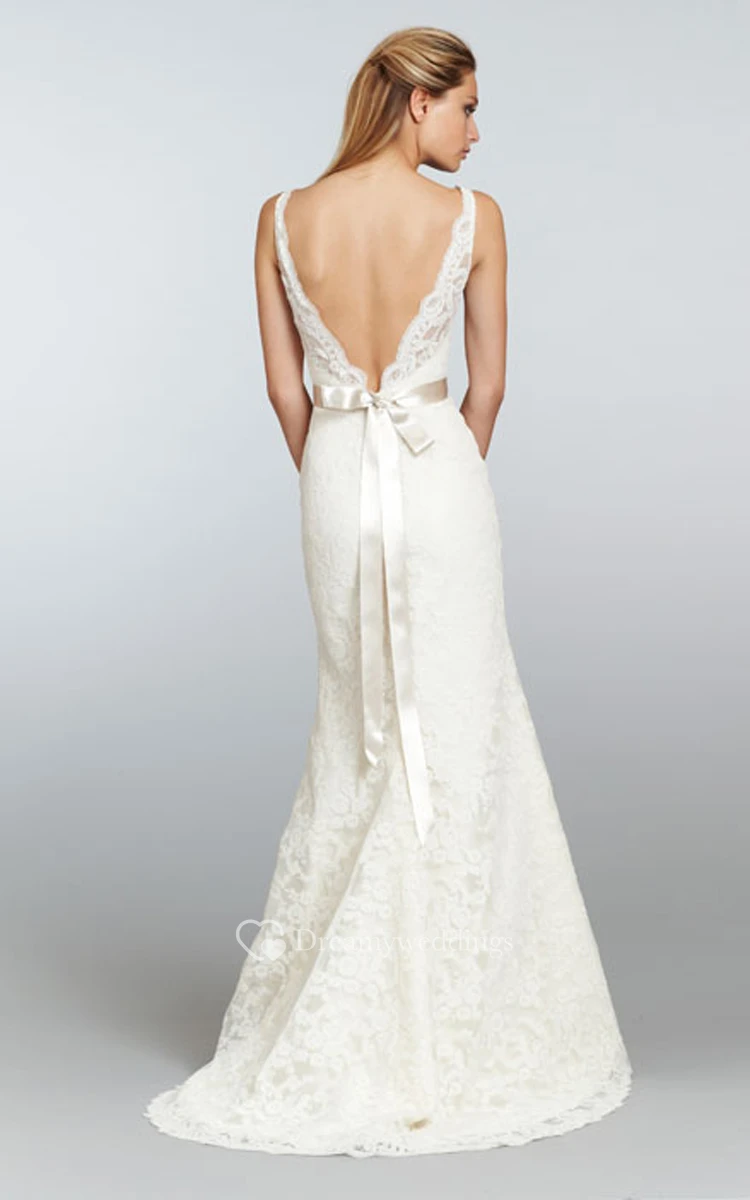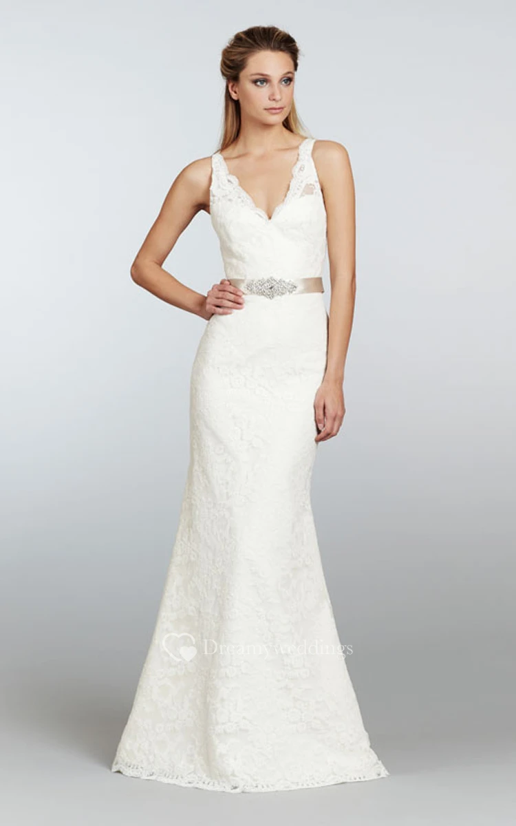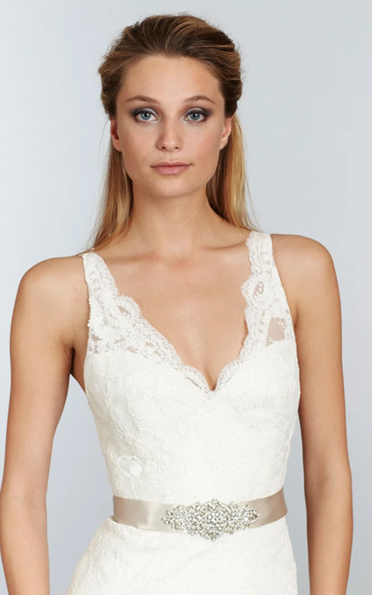 Stunning V-Neck Long Lace Dress With Crystal Ribbon Sash