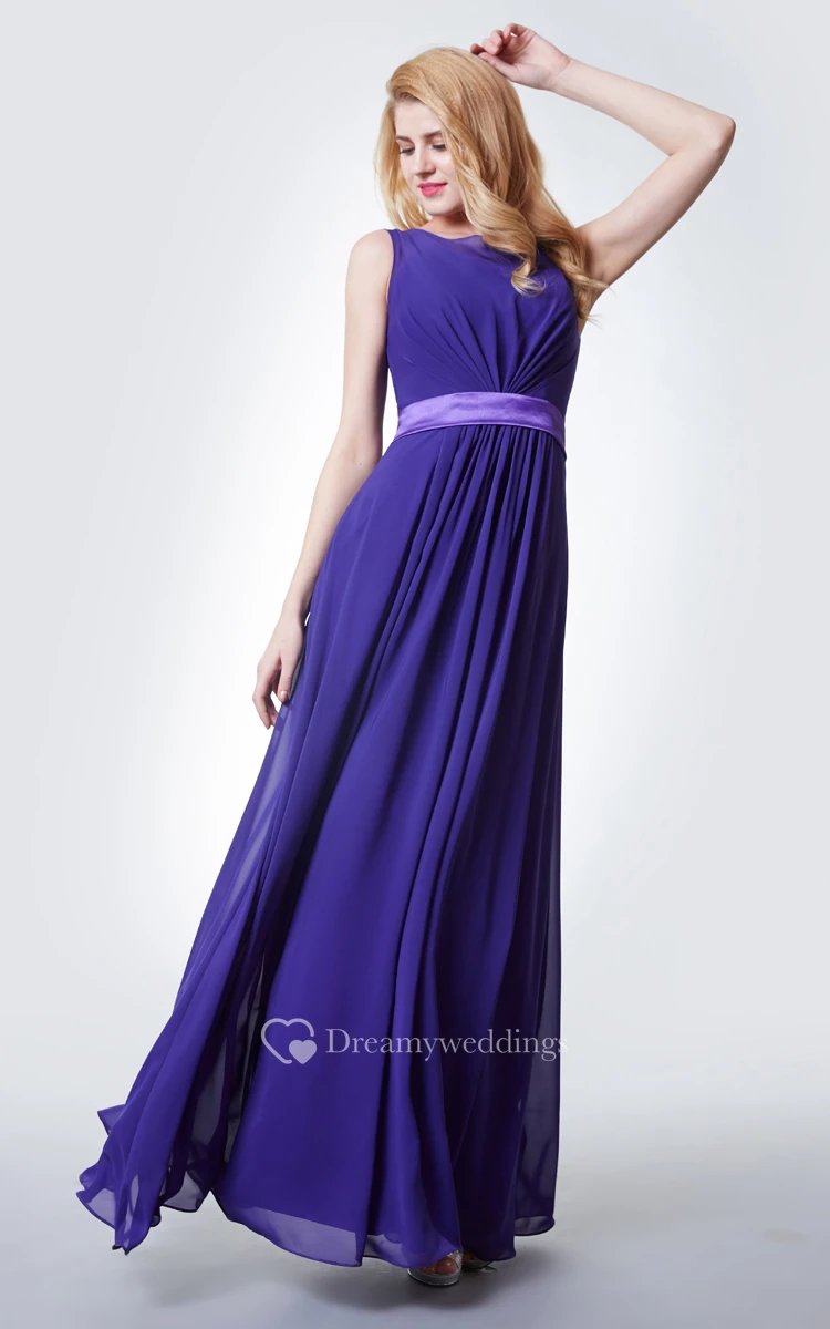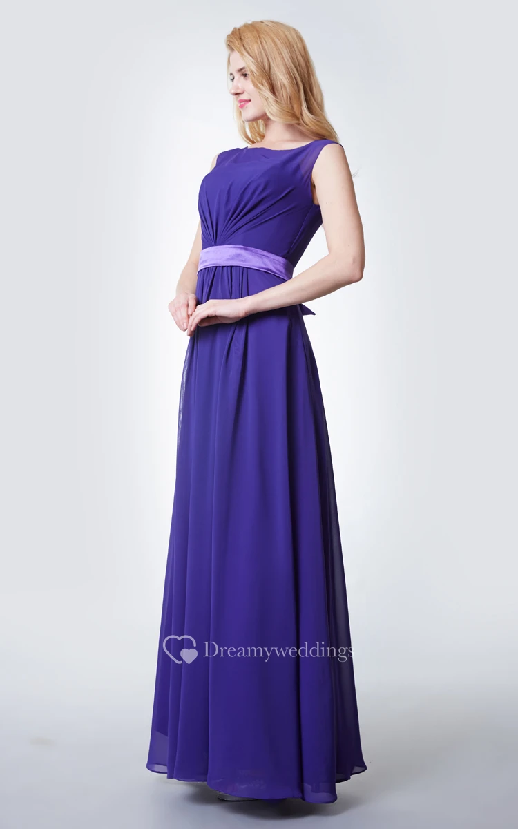 Stylish Cap-sleeved Long Chiffon Dress With Satin Sash