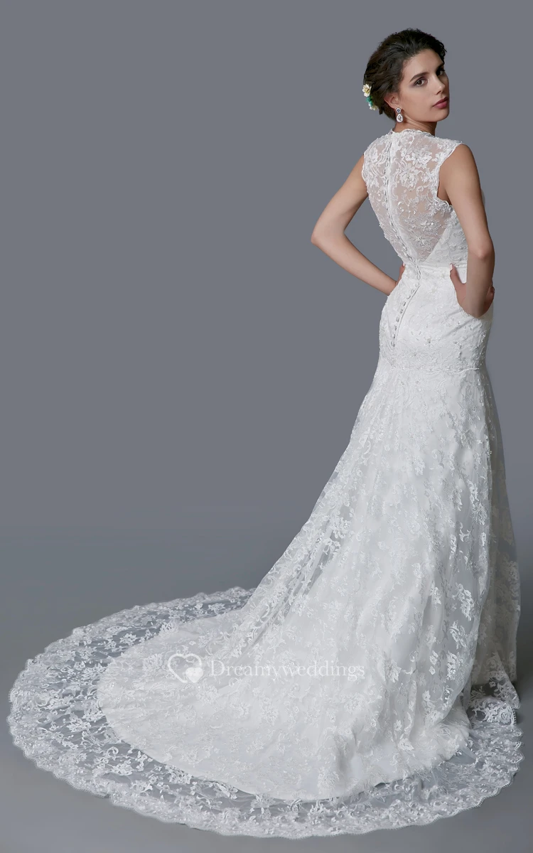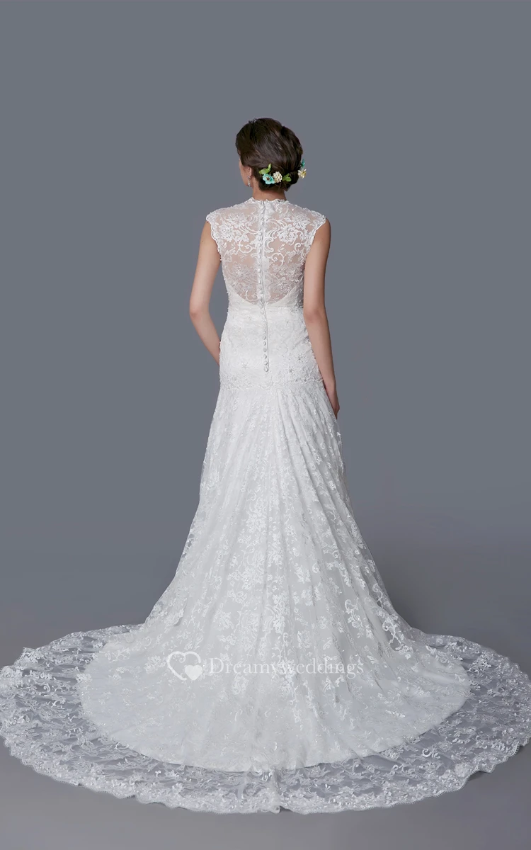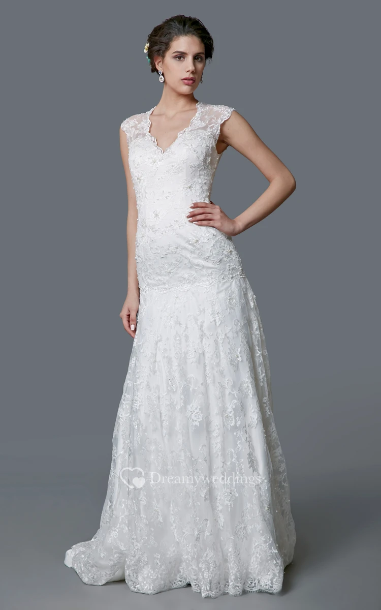 This wedding gown is stylish and timeless. The lovely lace pattern creates a V-neck and wide cap sleeves, with a stunning illusion back. The sheath dress has a drop waist that hits right at the hips, spilling out into a gorgeous floor-length skirt with a court train. The lace overlay creates a delicate scalloped hem, adding one more element to this gorgeous dress.
