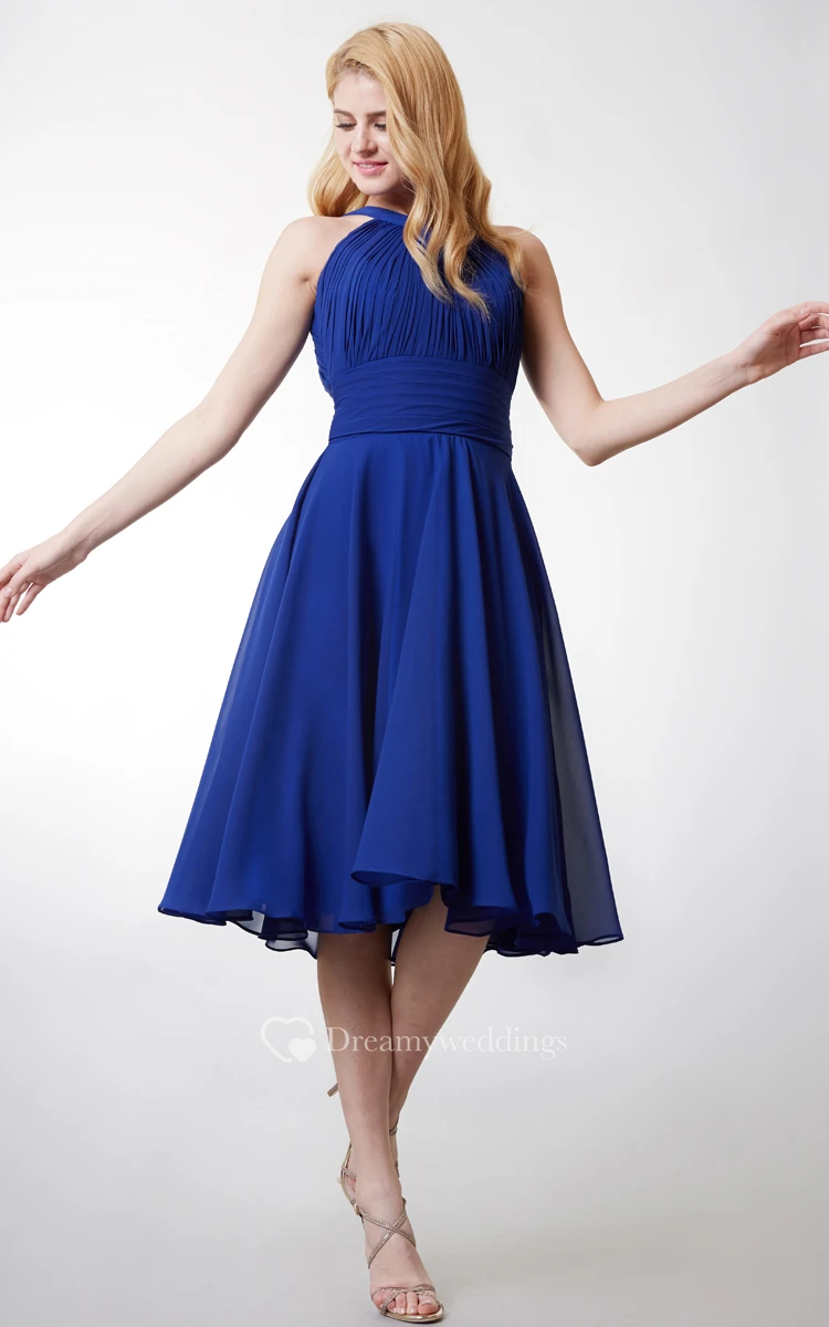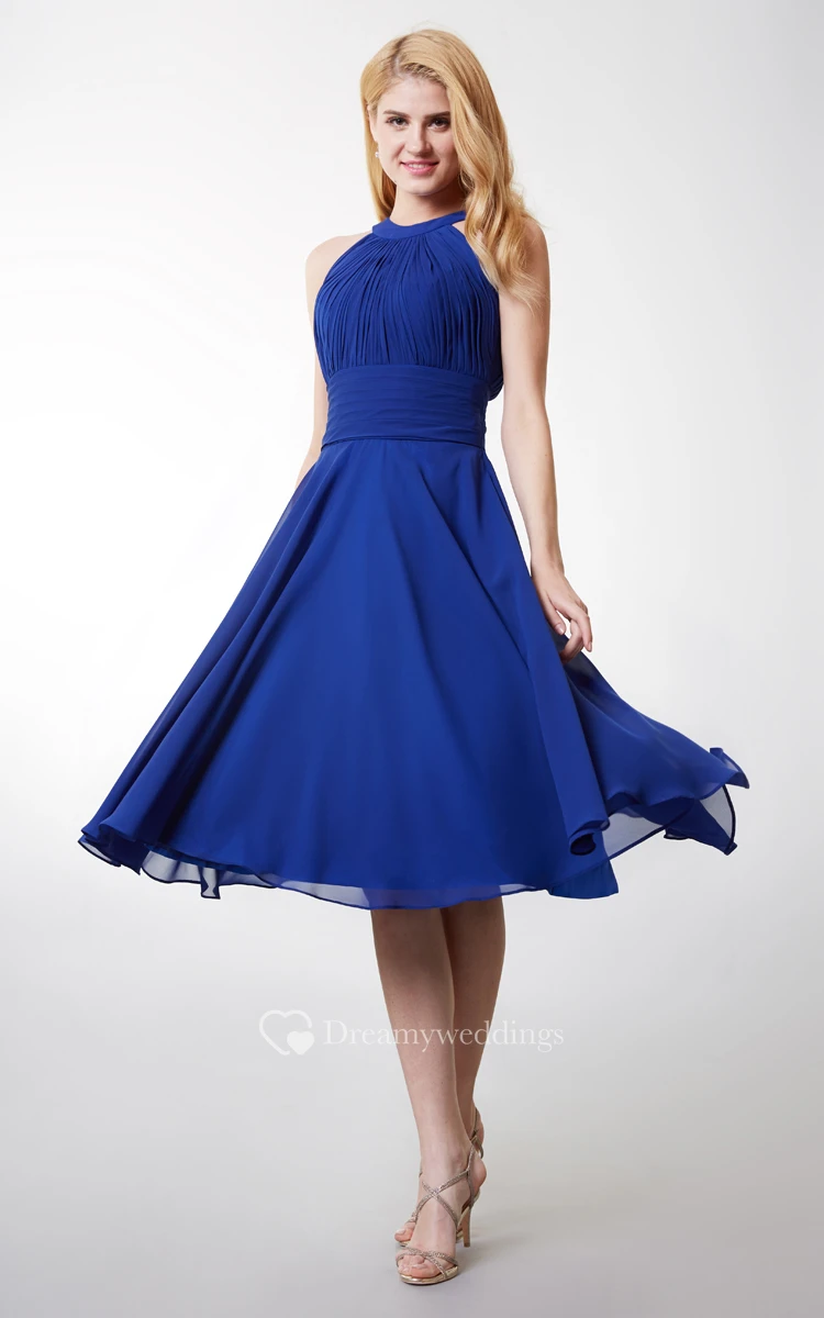 Stylish Halter Neck Pleated Knee Length Chiffon Dress