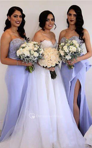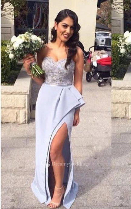 Sweetheart Beading Appliques Front Split Ruffles Lace Sequins Satin Dress