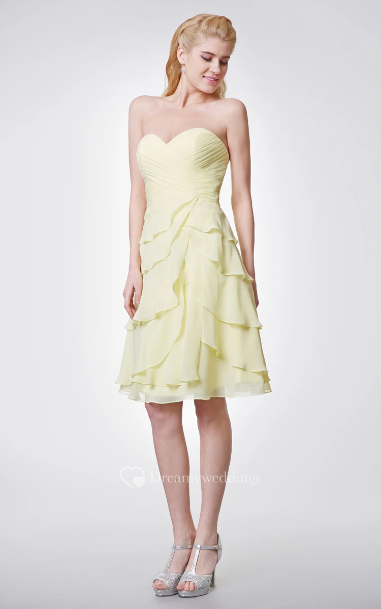 Your bridal party will make a playful yet still sophisticated statement in this eye-catching sweetheart chiffon knee-length layered dress. A beautiful and modern fitted sweetheart style neckline flatters the figure and is accented with delicate crisscross style drapery. A knee-length chiffon skirt is decorated with cascading ruffles in a layered style. Perfect for any fashion-forward bridesmaid and any stylish wedding.