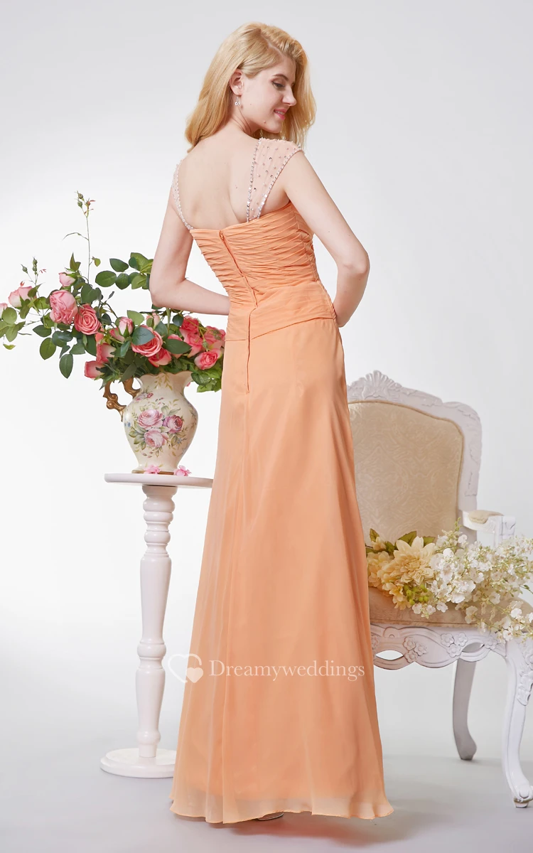 You’ll look elegant and sophisticated at your next formal event in this beautiful sweetheart crisscross ruched a-line long chiffon dress. Delicate ruching in a modern crisscross pattern decorates the fitted sweetheart style neckline. Elegant illusion cap sleeves wrap around into a slightly open back. Flowing pleats accent the full-length chiffon skirt for an eye-catching appearance that’s perfect for any formal event.