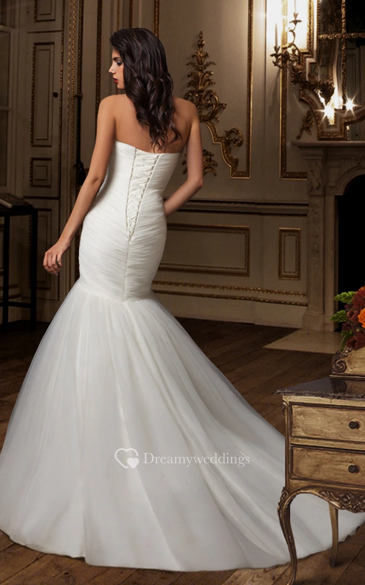 I purchased this mermaid style strapless dress for my wedding from here. It looks nothing less than an expensive designer gown. I absolutely adore the sweetheart neckline, ever since I decide to get married near a beach I was worried of my dress blowing away in the wind, but with this cut that will not happen, perfect for a beach day. The style of the dress is simple yet classy, the fabric has a lacelike feel to it, it's sleeveless, so I will not get hot even if the temperature rises near the beach. The detail of the dress is amazing, and they are offering the customers custom size which is great for someone like me who does not have model like figure. The price is not much for a wedding dress thanks to the discount. The back of the dress is even more beautiful. You can see that the dress was made with great care and observation, every detail took care of. I always wanted to wear a classic white gown for my big day, and I am getting that in this dress, the dress is all about style and elegance, and it look make me look perfect on my special day.