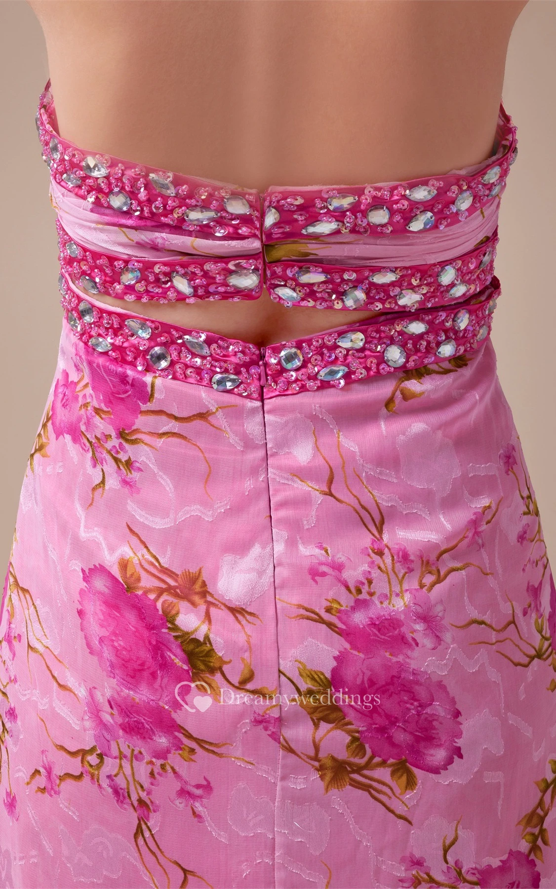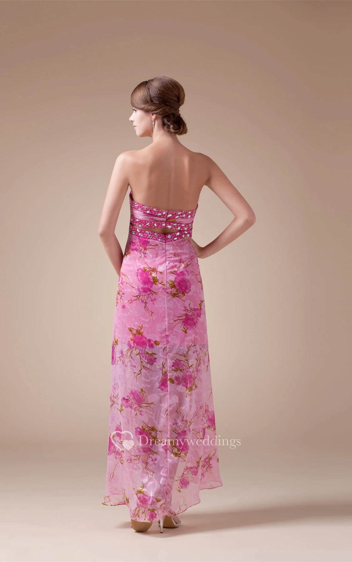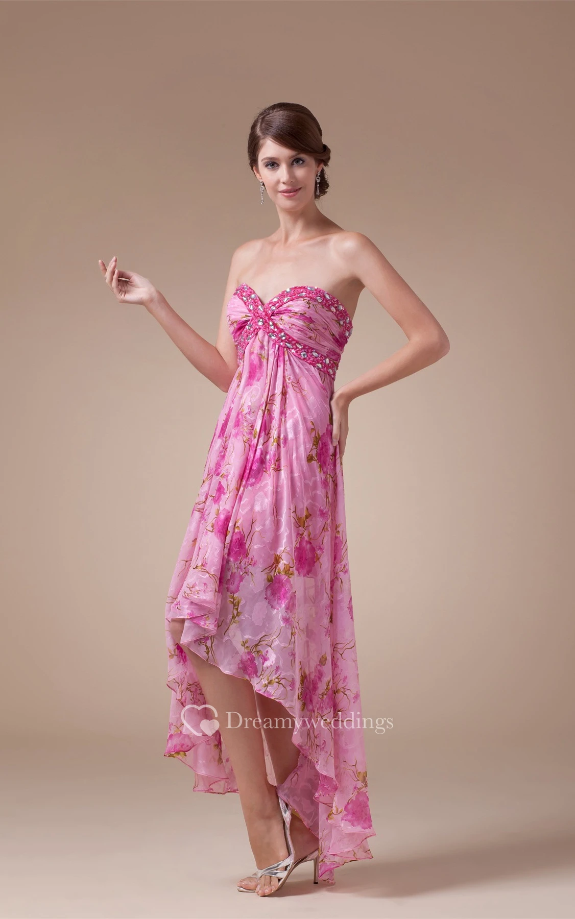 Sweetheart High-Low Empire Criss-Cross Floral Print and Dress With Jewel