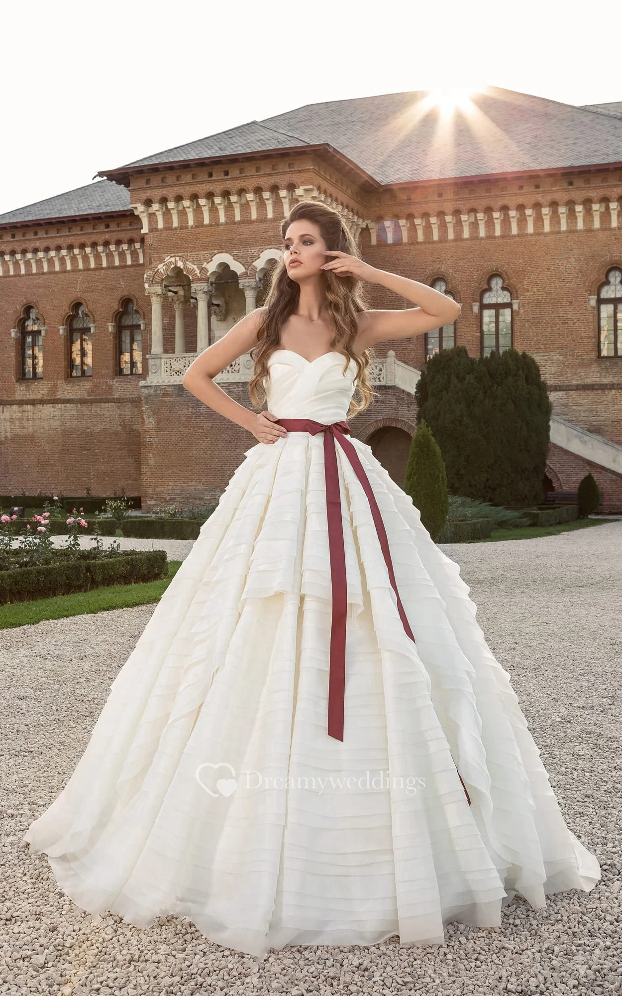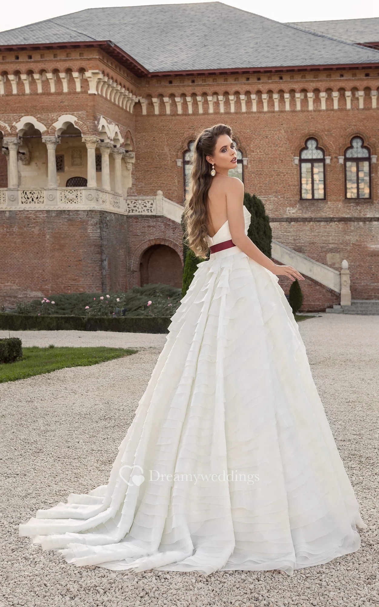 Sweetheart Low V Back Bow Dress With Cascading Ruffles