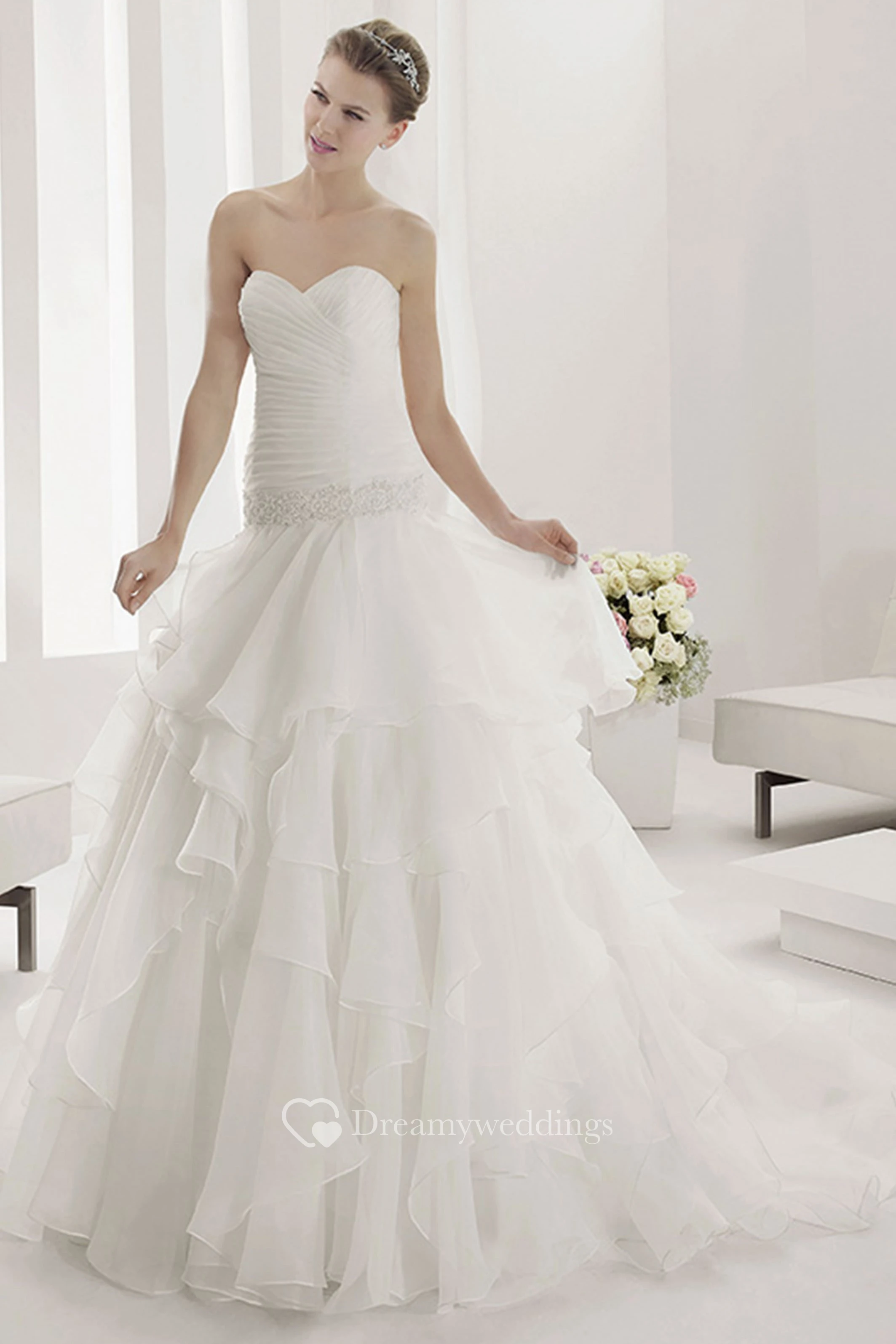 Sweetheart Ruched Bodice Wrop Waist Bridal Gown With Layered Tulle Skirt
