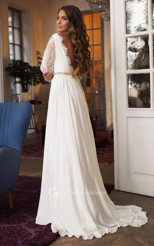 Taffeta Lace Floor-length Brush Train A Line Long Sleeve Modest Wedding Dress
