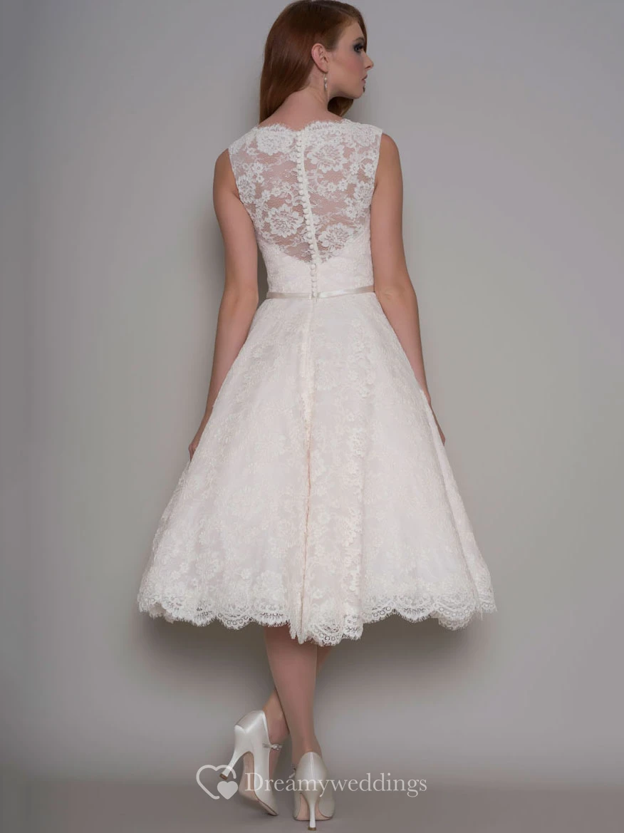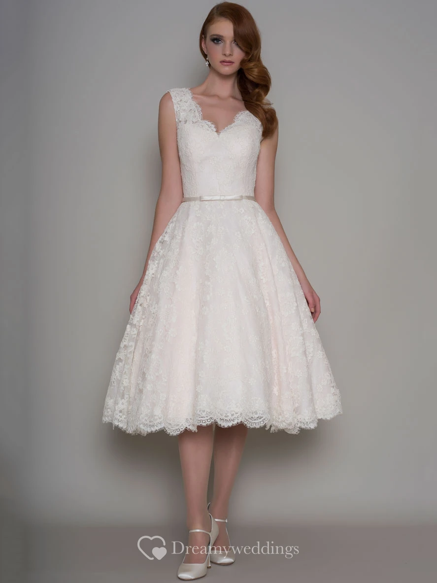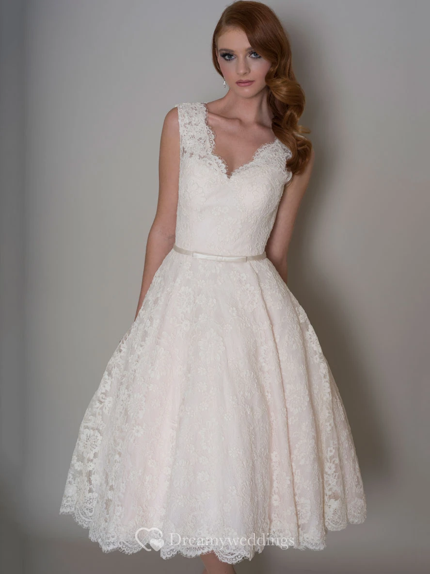 Tea-Length A-Line Appliqued V-Neck Sleeveless Lace Wedding Dress
