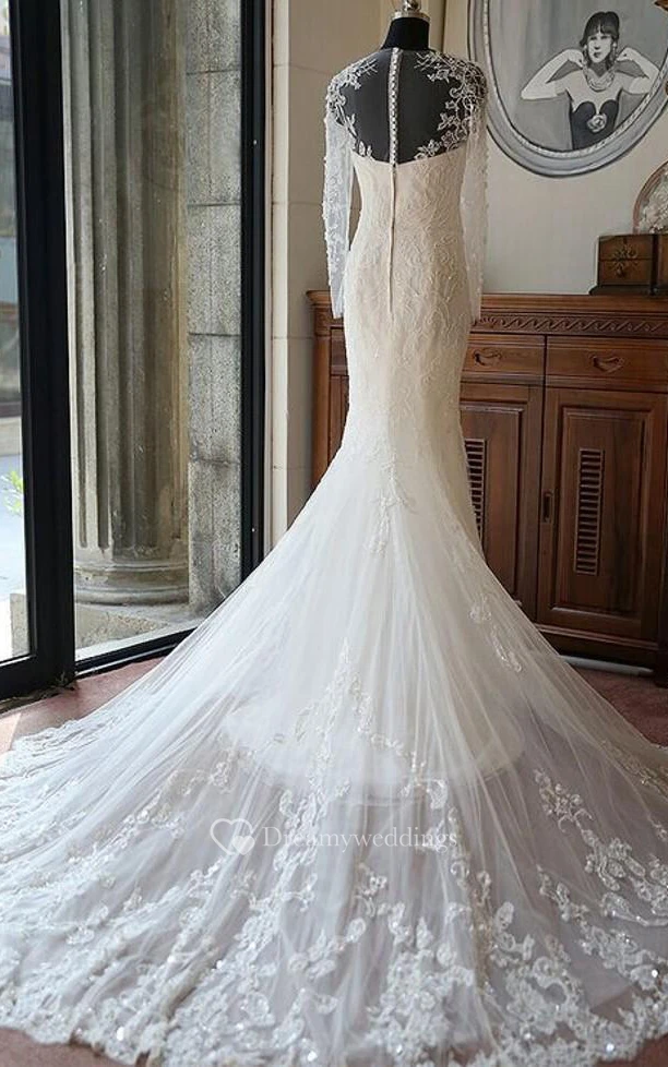 Illusion Scoop-neck Long Sleeve Mermaid Wedding Dress With Beading And Chapel Train