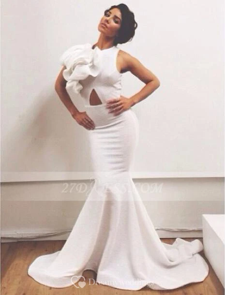 Train Sexy Prom Dresses With White Jewel Sleeveless Flower Mermaid Satin Sweep Evening Gowns