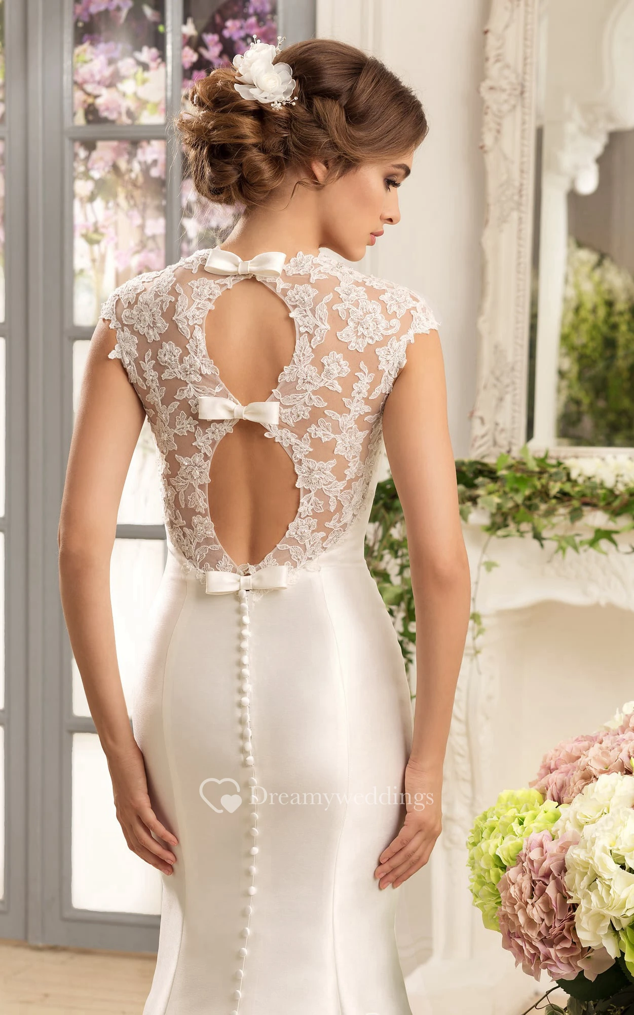 Trumpet Floor-Length Queen-Anne Cap-Sleeve Keyhole Satin Dress With Lace