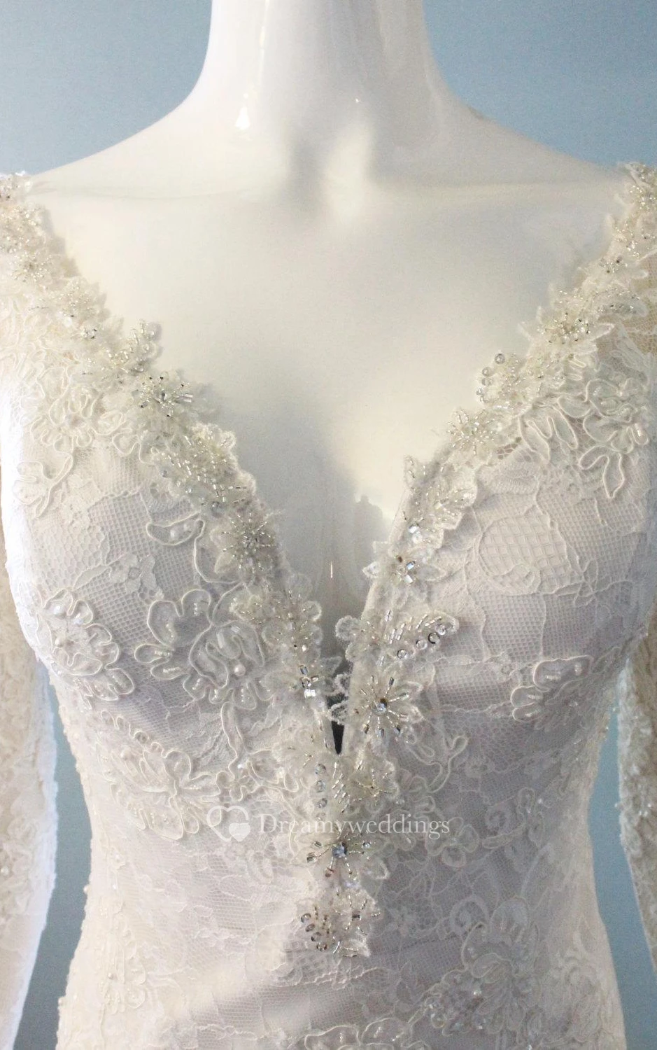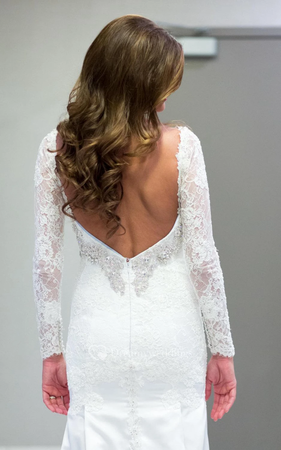 Trumpet V-Neck Long Sleeve Lace Satin Dress With Beading Appliques Button