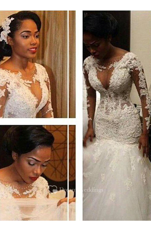 Trumpet V-neck Long Sleeves Lace Court Train Lace Tulle Wedding Dresses