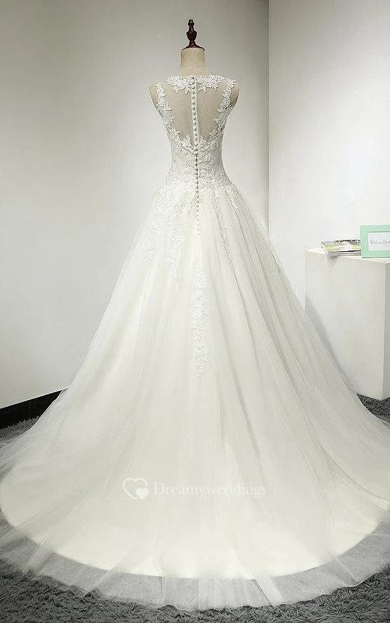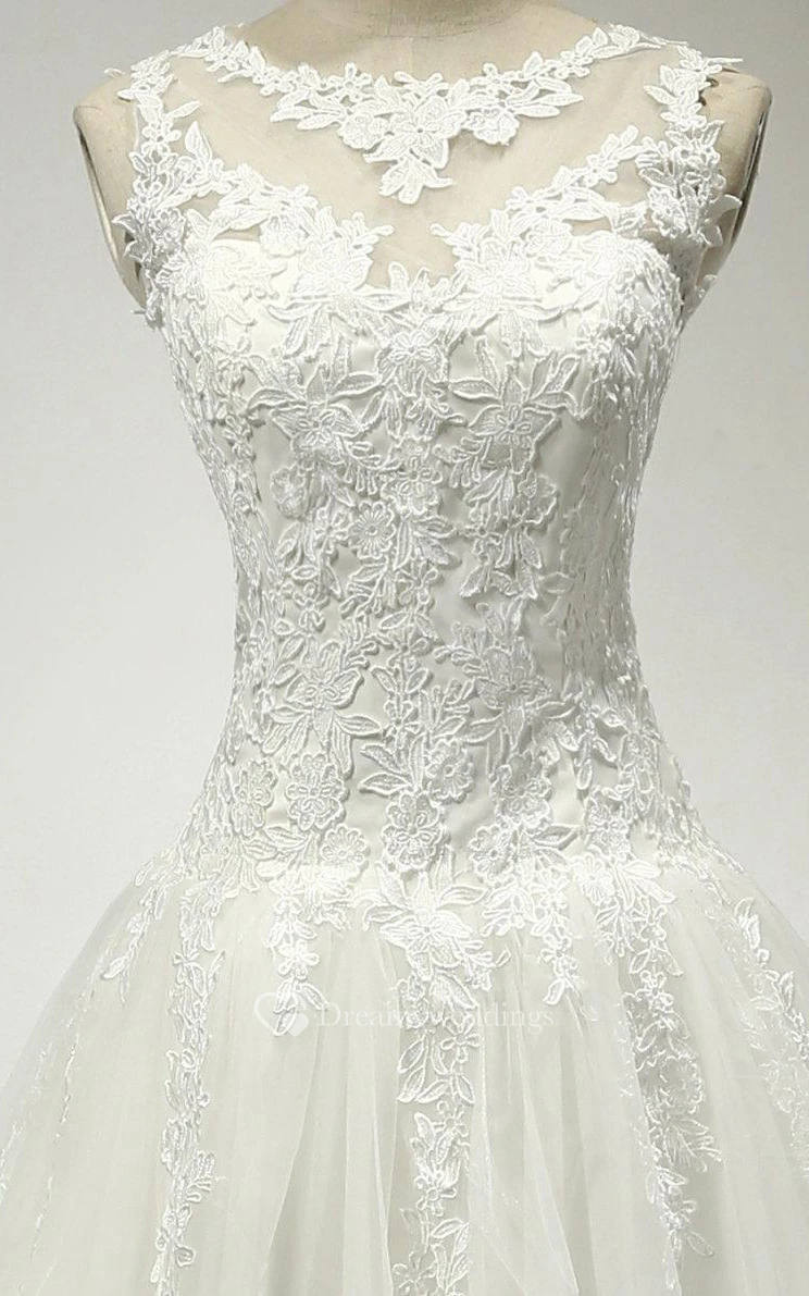 Tulle and Lace A-Line Sleeveless Dress With Jewel Neckline and Keyhole Back