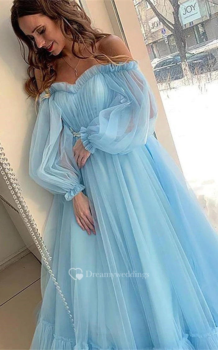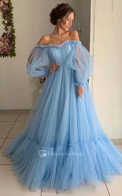 Tulle Floor-length Brush Train Ball Gown Long Sleeve Ethereal Prom Dress with Ruffles