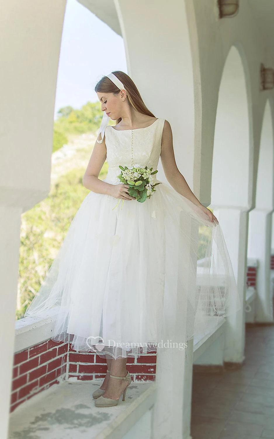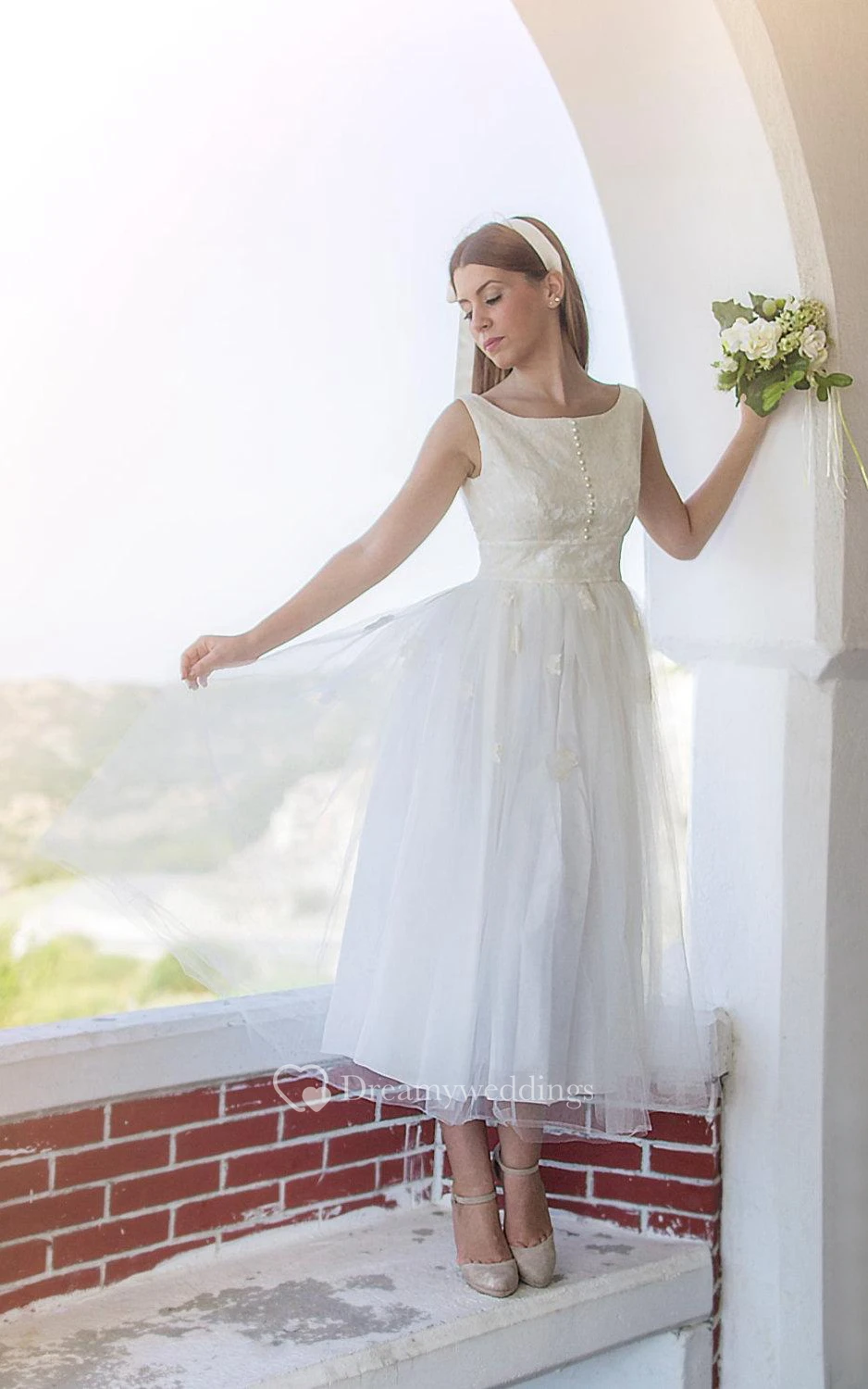 Tulle Tea Length Sleeveless Bateau Neck Dress With Beadings and Low-V Back