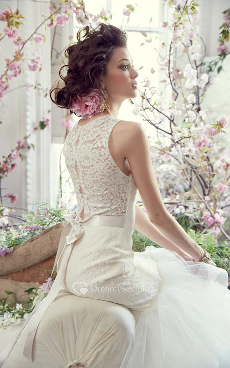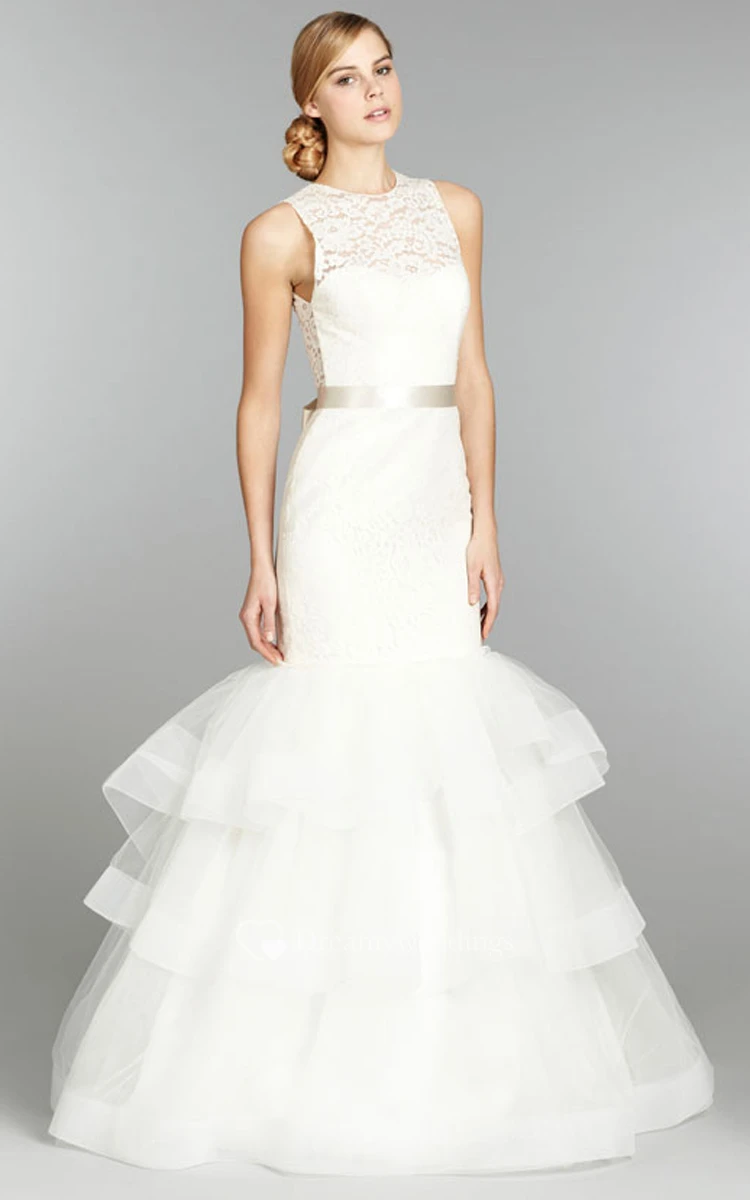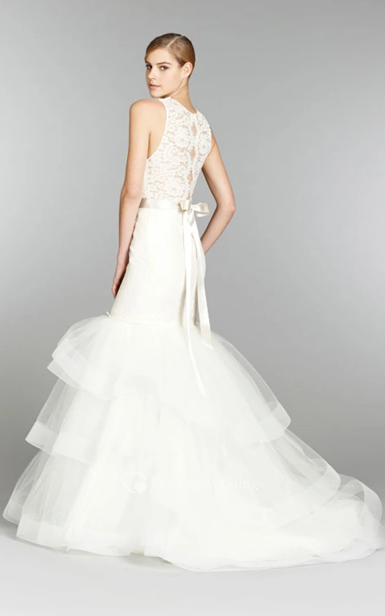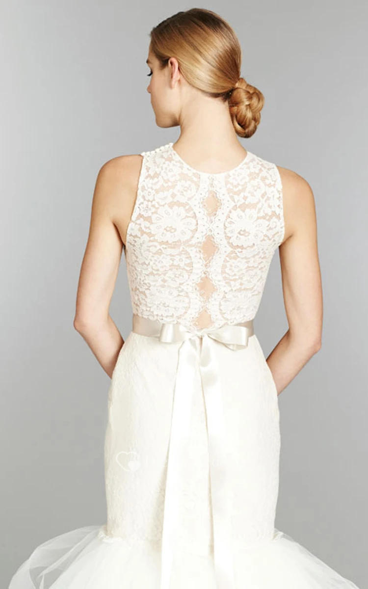 Unique Lace Jewel Neck Tiered Tulle Dress With Ribbon Belt