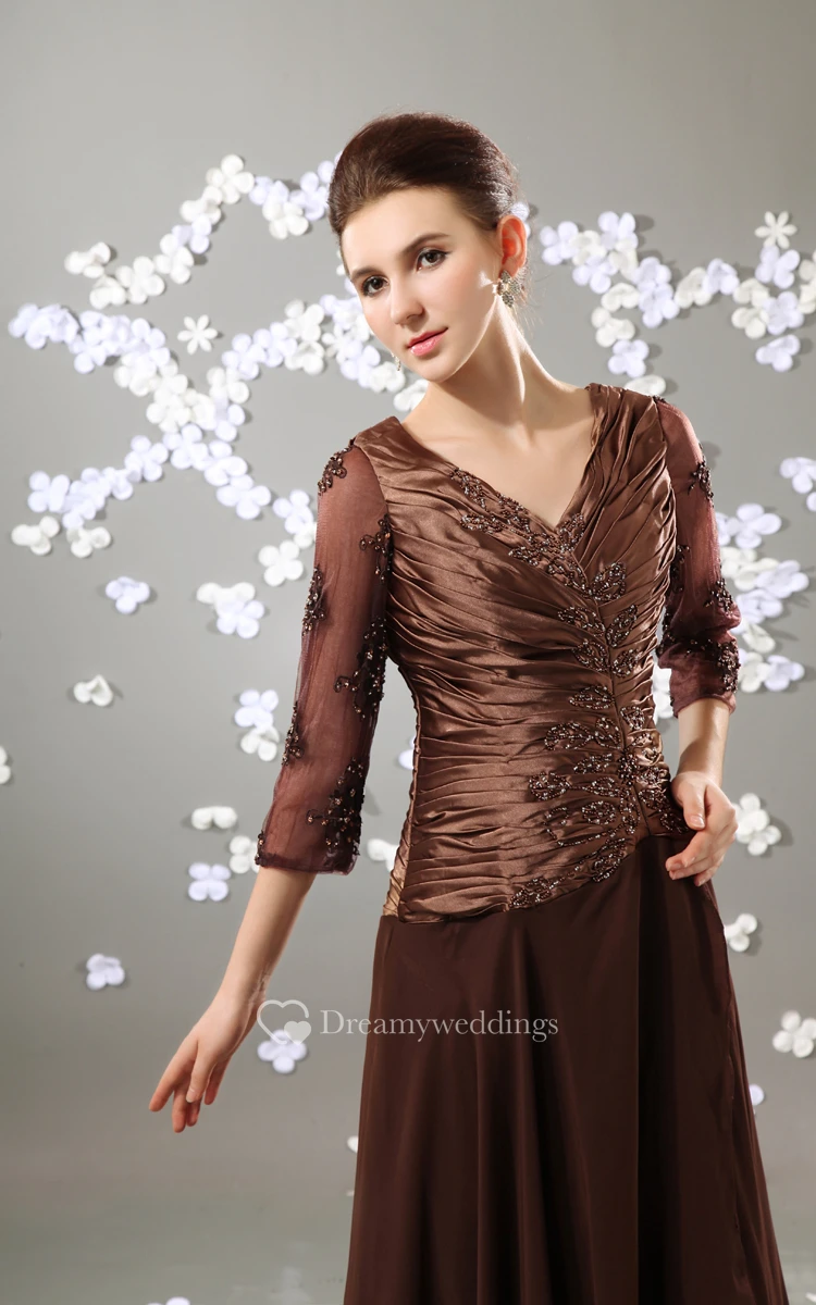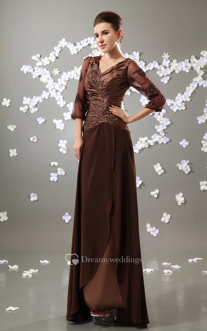 V-Neck 3-4 Sleeve Chiffon Floor-Length Dress With Ruched Top