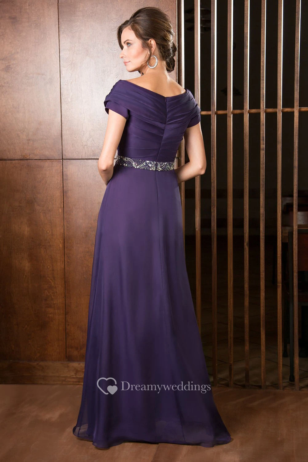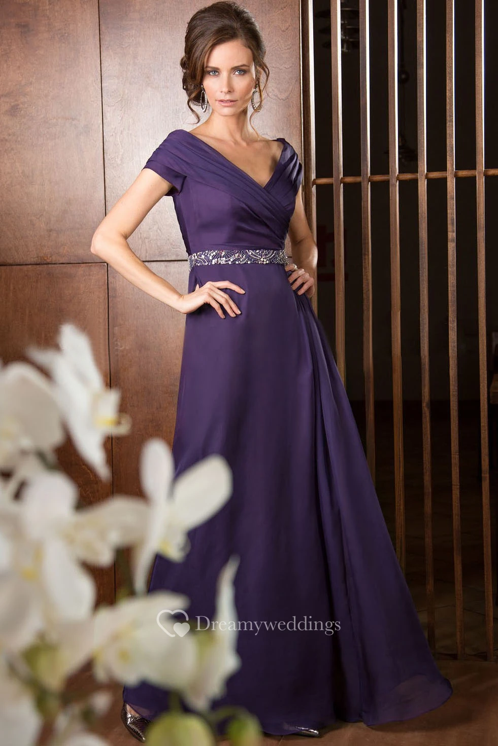 V-Neck A-Line Long Mother Of The Bride Dress With Ruches And Sequins