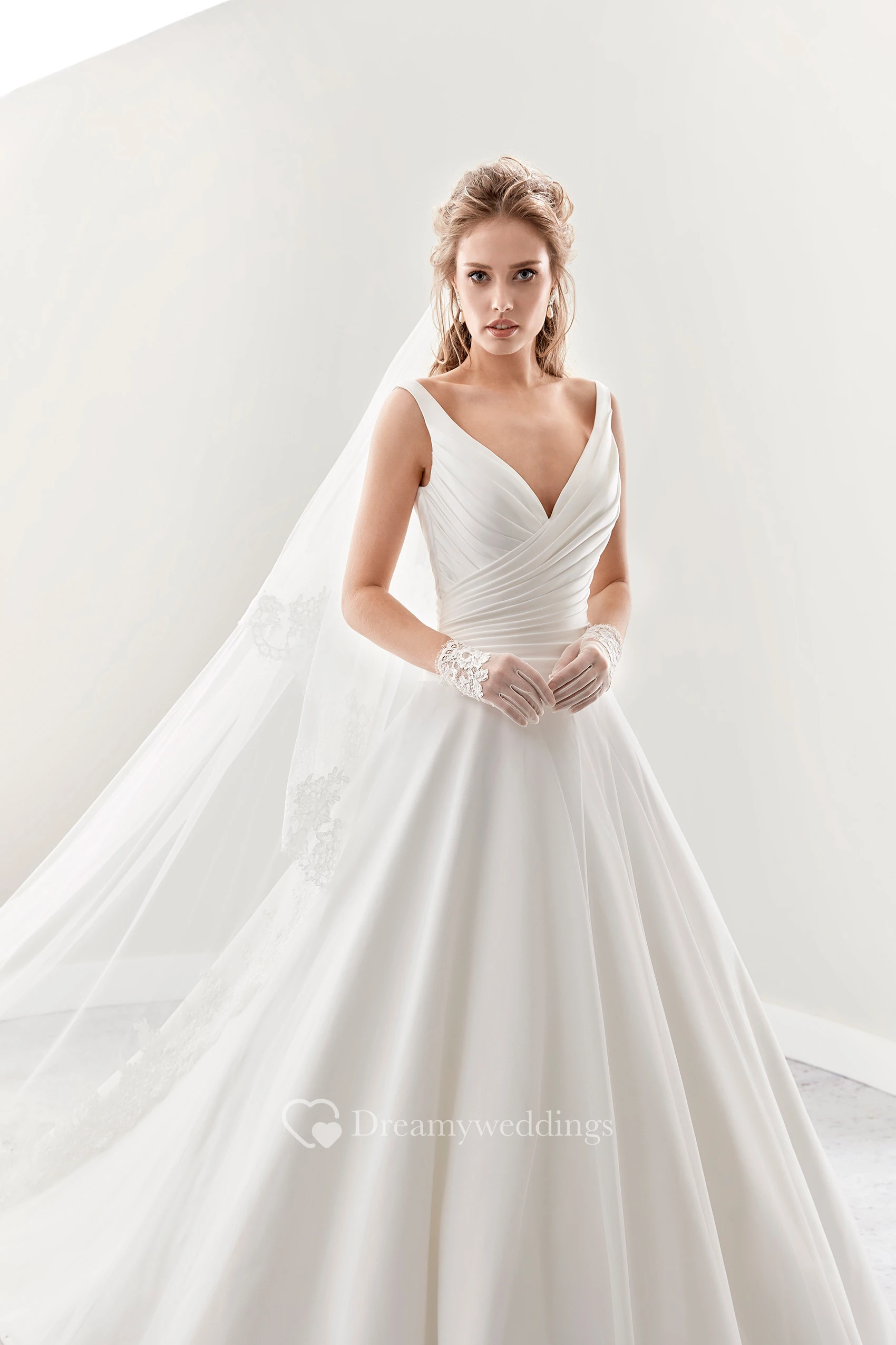 V-Neck A-Line Pleated Bridal Gown With Low-V Back And Brush Train