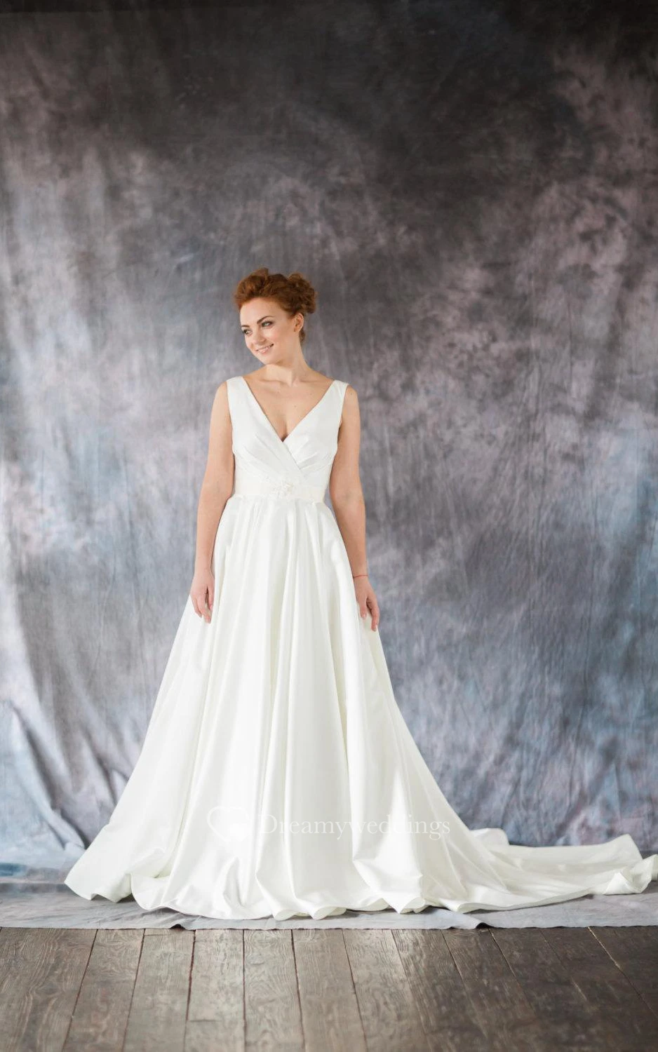 V-Neck A-Line Satin Dress With Low-V Back and Pleats