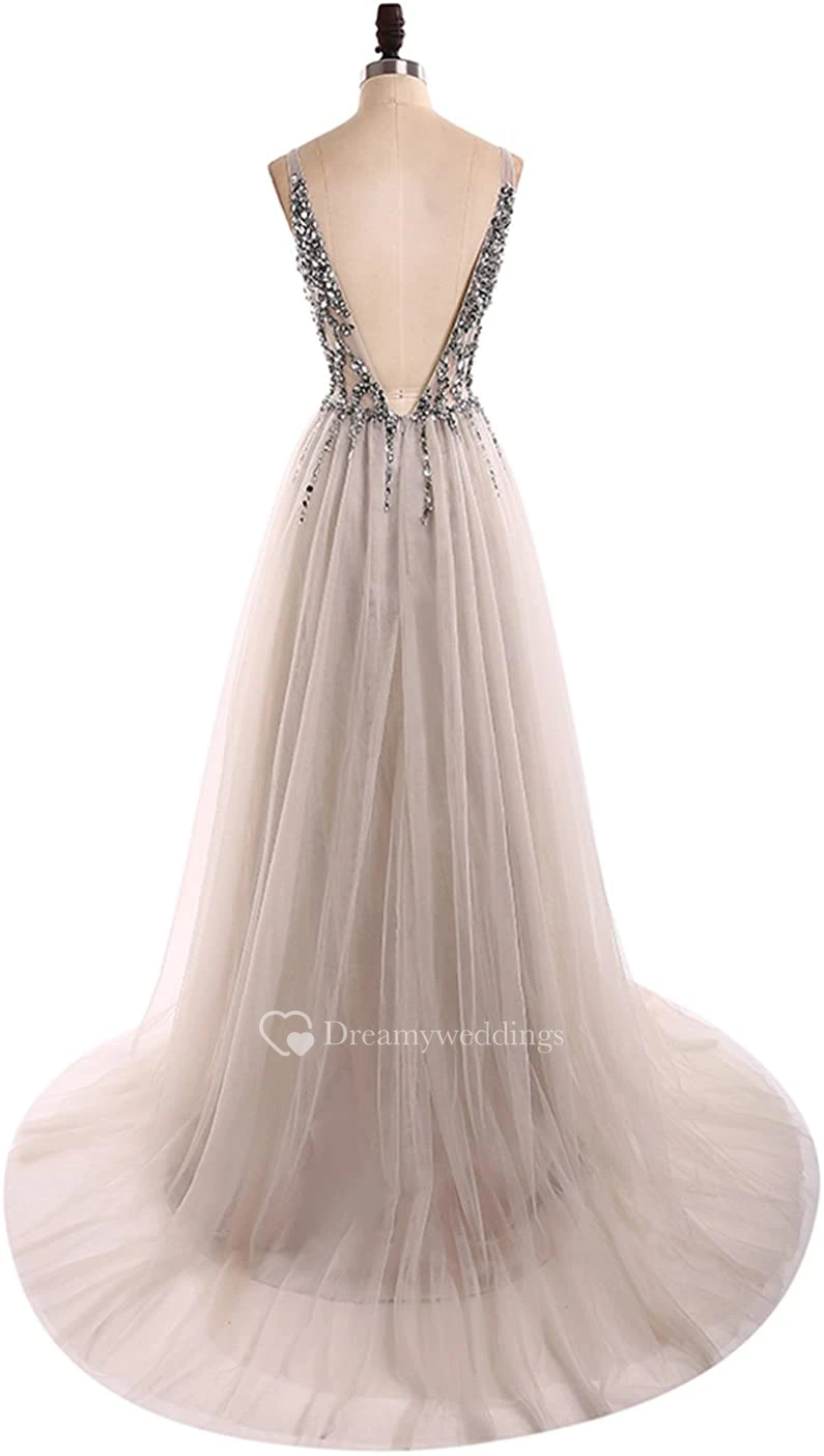 V-neck A Line Sleeveless Floor-length Court Train Tulle Prom Dress With Beading