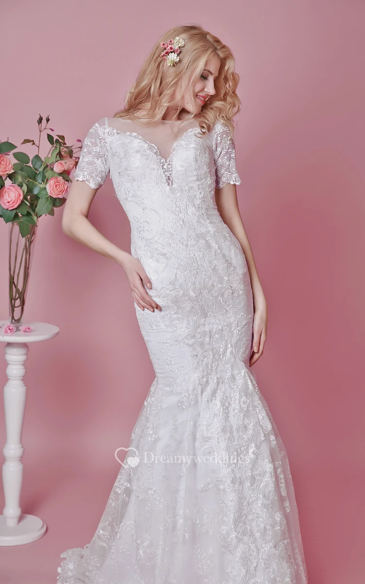 A mermaid silhouette fashions a natural curve to the waist of this full length gown. The snug fitting bodice has a delicate plunge to the V-shape bust line, with an added neckline of illusion fabric. Short sleeves with scalloped lace edges, taper nicely into the low cut back, covered in illusion fabric. Ruche pleats create a gentle flare to the skirt that is finished with a trailing train.