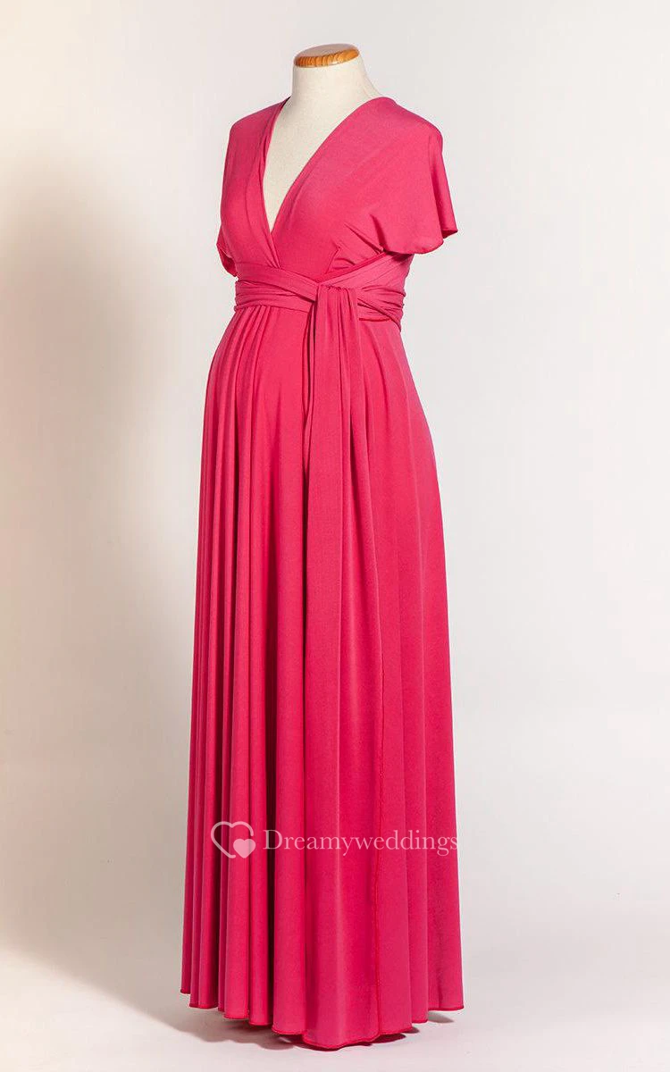 V Neck and V Back Short Sleeve Pleated A-line Jersey Long Dress With Sash