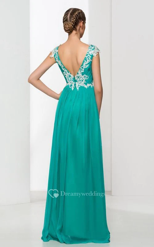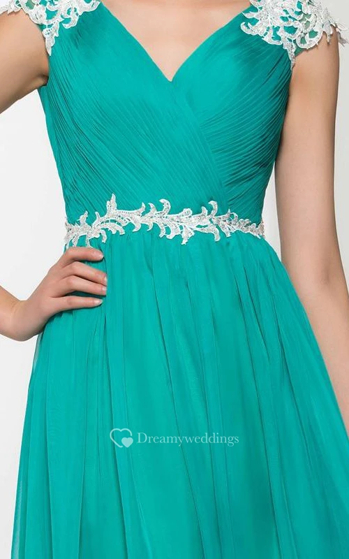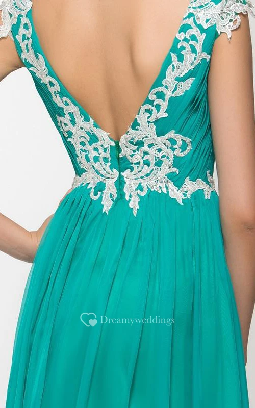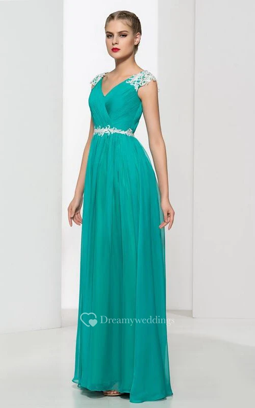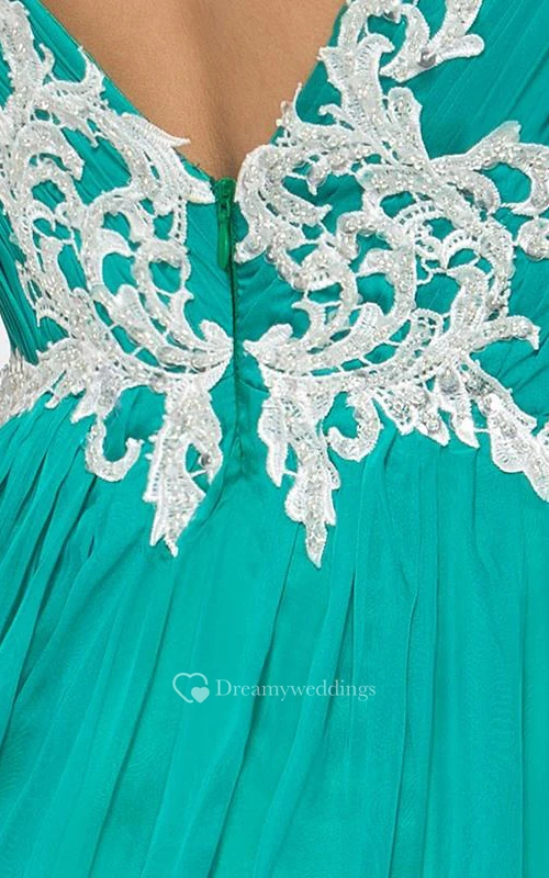 V-Neck Appliques Pleats Long Prom Dress