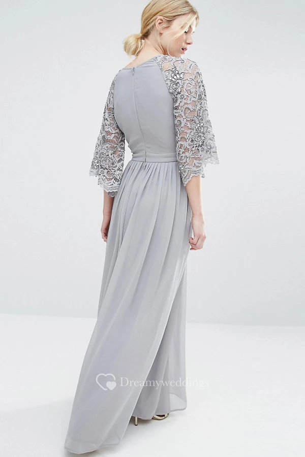 V-Neck Bell Sleeve Lace Chiffon Bridesmaid Dress With Pleats