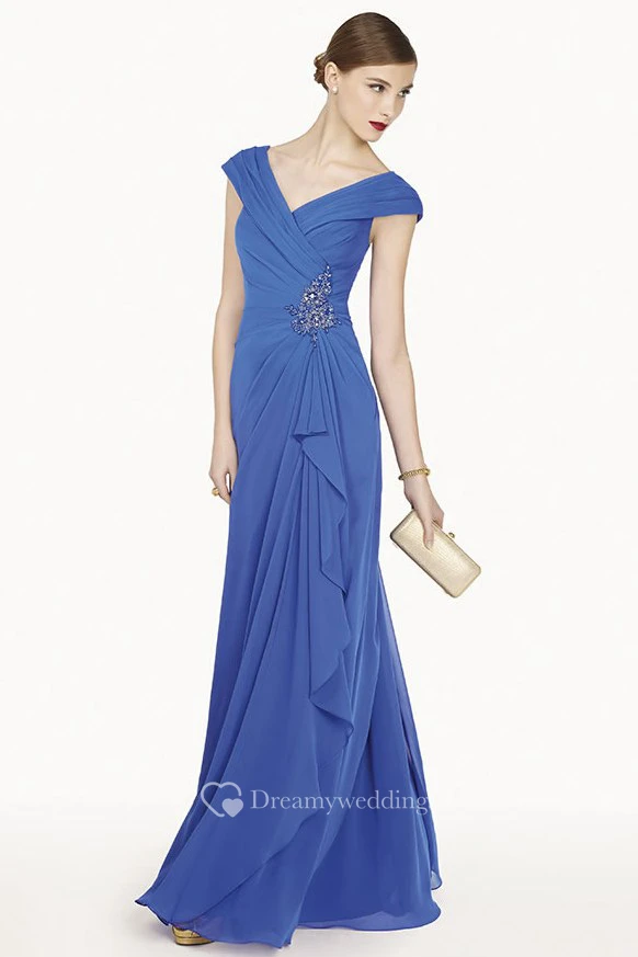 V Neck Cap Sleeve A-Line Chiffon Long Prom Dress With Ruffles